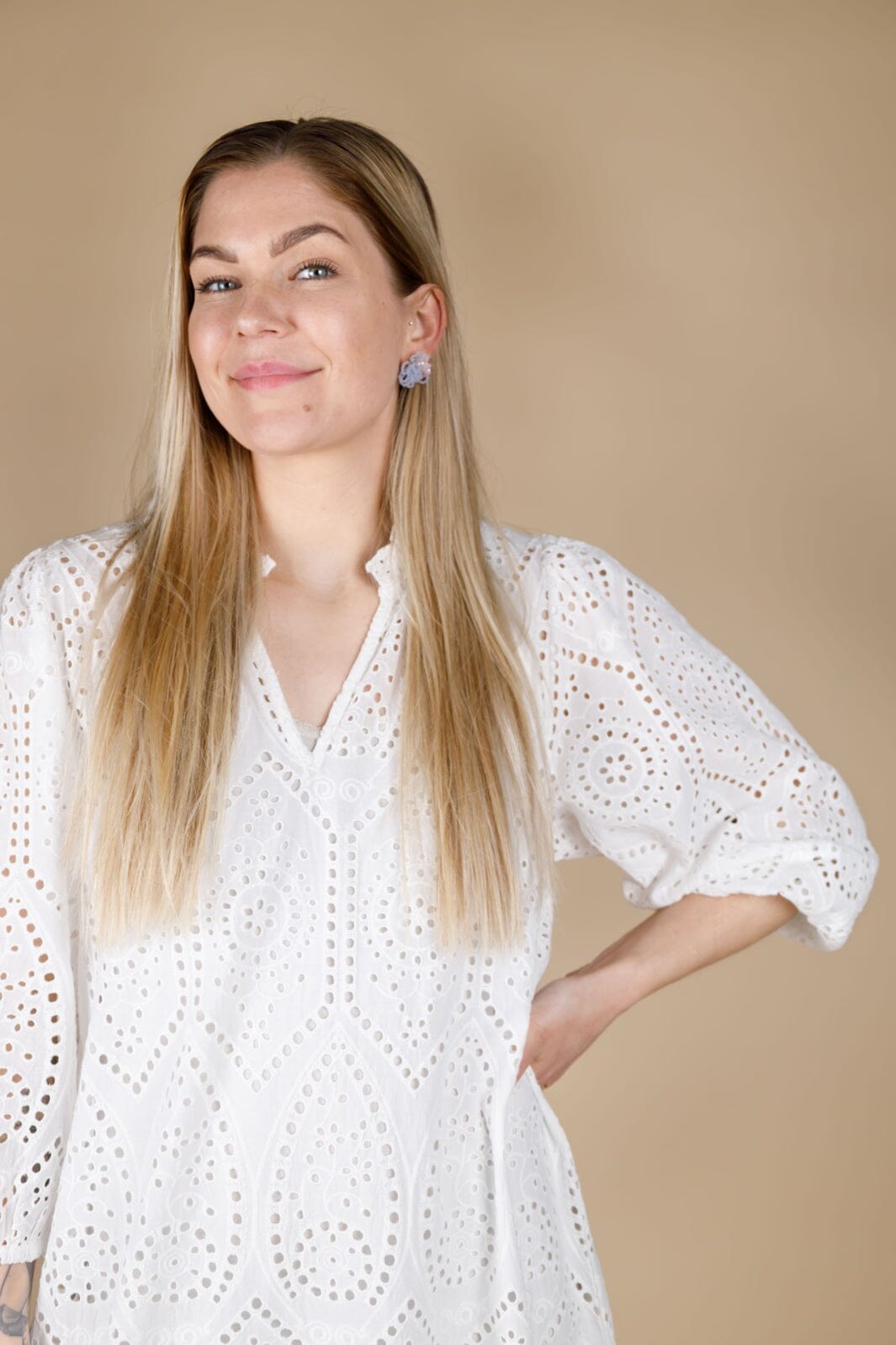 Øredobber fra Black Colour i lyseblå med små perler i et blomsterlignende design. Øredobbene har et komplekst mønster med løkker og perlegrupper.