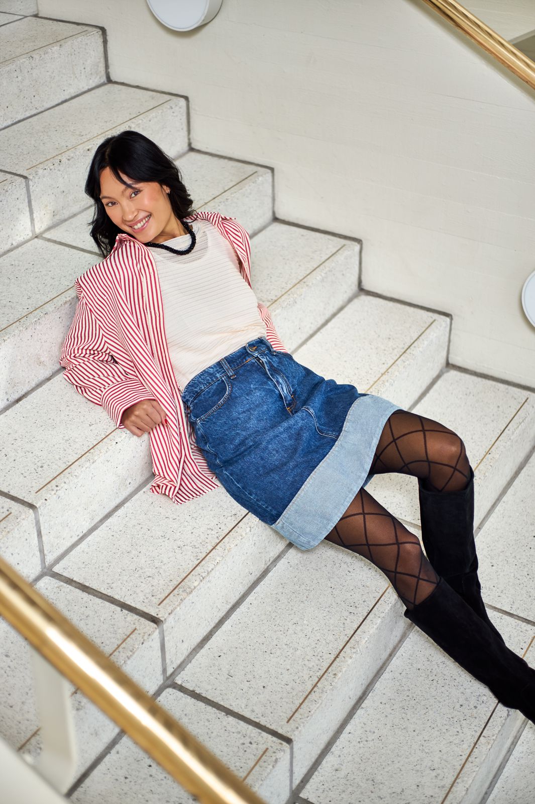 Denimskjørt fra Black Colour, laget av bomull i en mellomblå nyanse. Skjørtet har en kontrasterende lysere kant nederst og beltehemper.