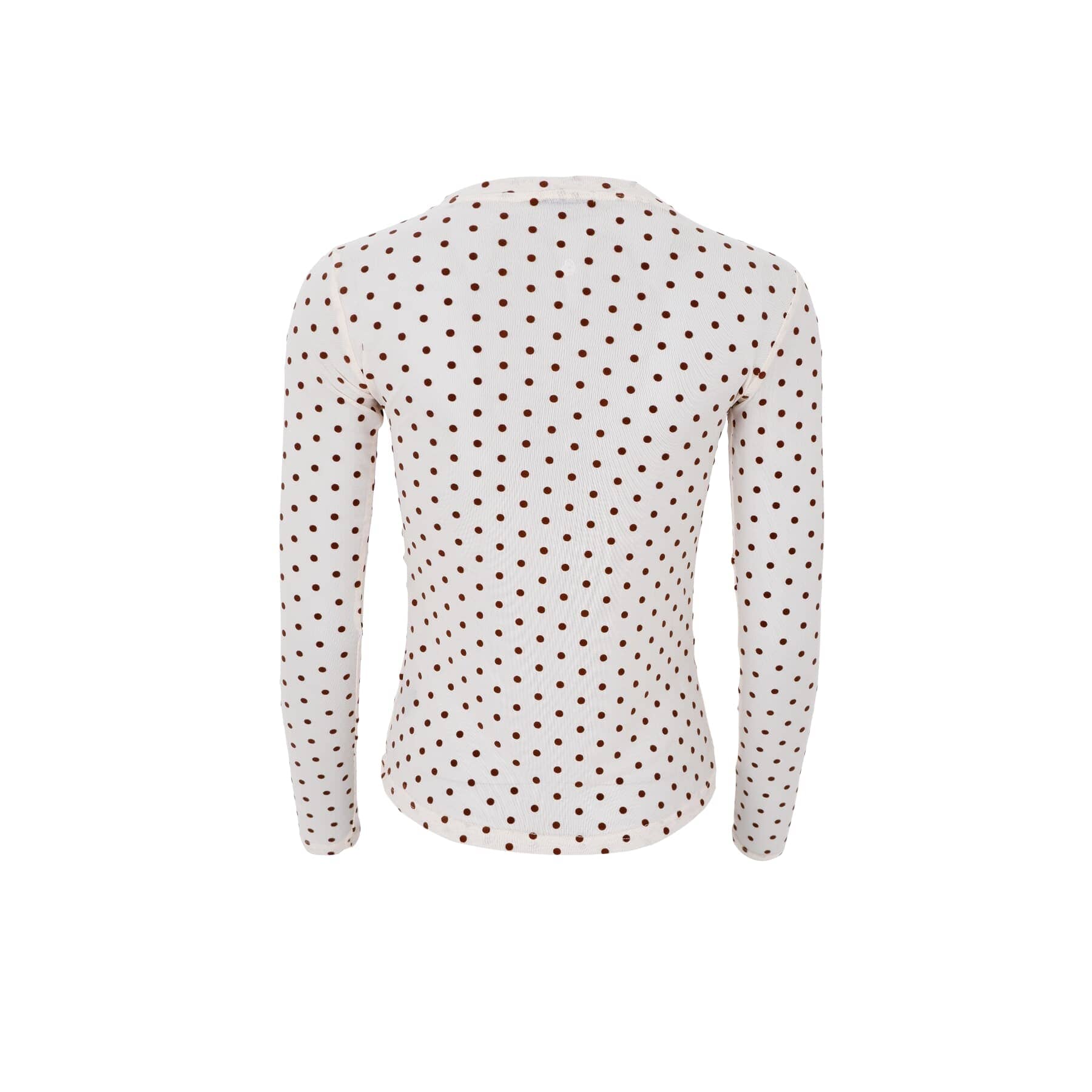 Mesh-bluse fra Black Colour i lys kremfarge med svarte prikker. Blusen har høy hals, lange ermer og en slim fit.