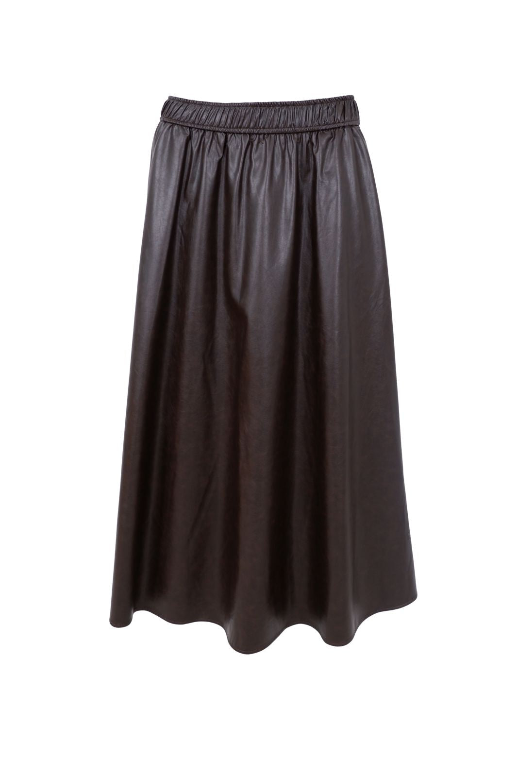 Brun skjørt fra Black Colour med en skinnende overflate. Skjørtet har en høy midje og en løs passform som rekker til midt på leggen.