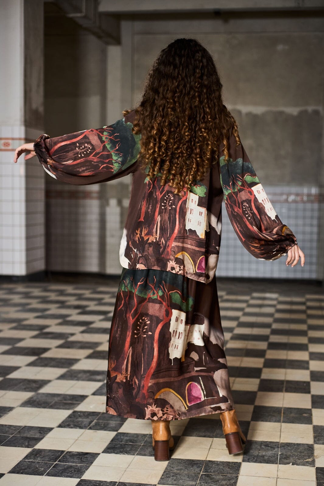 Skjørt fra Black Colour i kaffebrun viskose med et kunstnerisk trykk av trær og bygninger. Det har høy midje og en løs passform som går til midten av leggen.