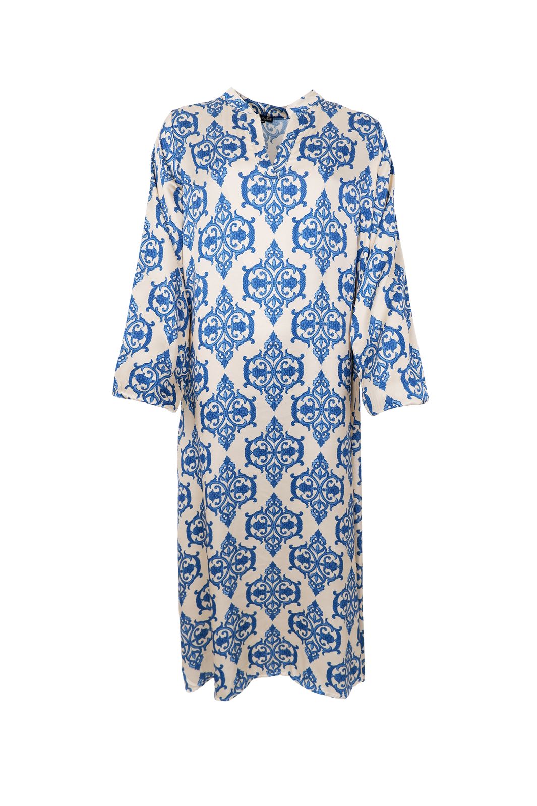 Satinkjole fra Black Colour med blått mønster på offwhite bakgrunn. Kjolen er laget av 100 % viskose og har V-hals samt trekvartlange ermer.