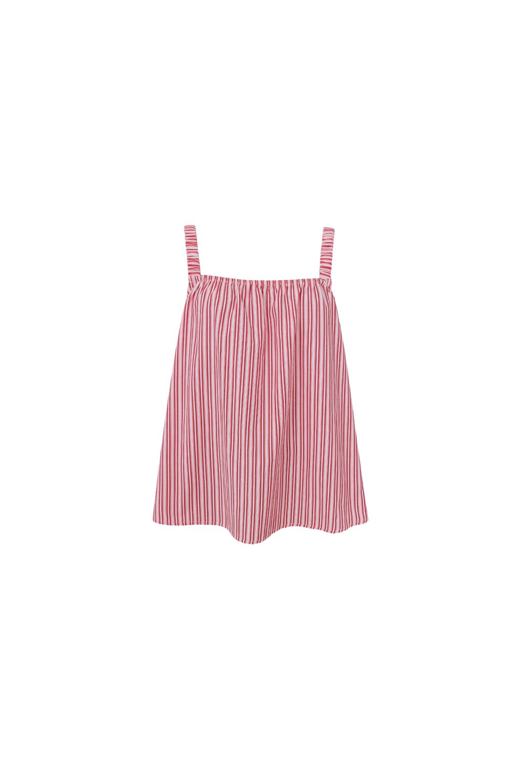 Stripet topp fra Black Colour med røde og rosa striper på hvit bakgrunn. Toppen har tynne stropper og en firkantet utringning.
