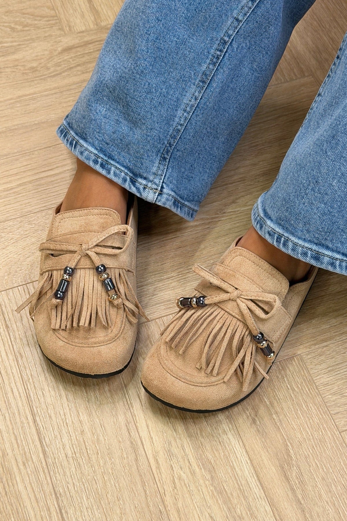 Loafers fra Bloom i taupe med slip-on-design. Dekorative dusker med perler foran og åpen hæl gir et avslappet uttrykk.
