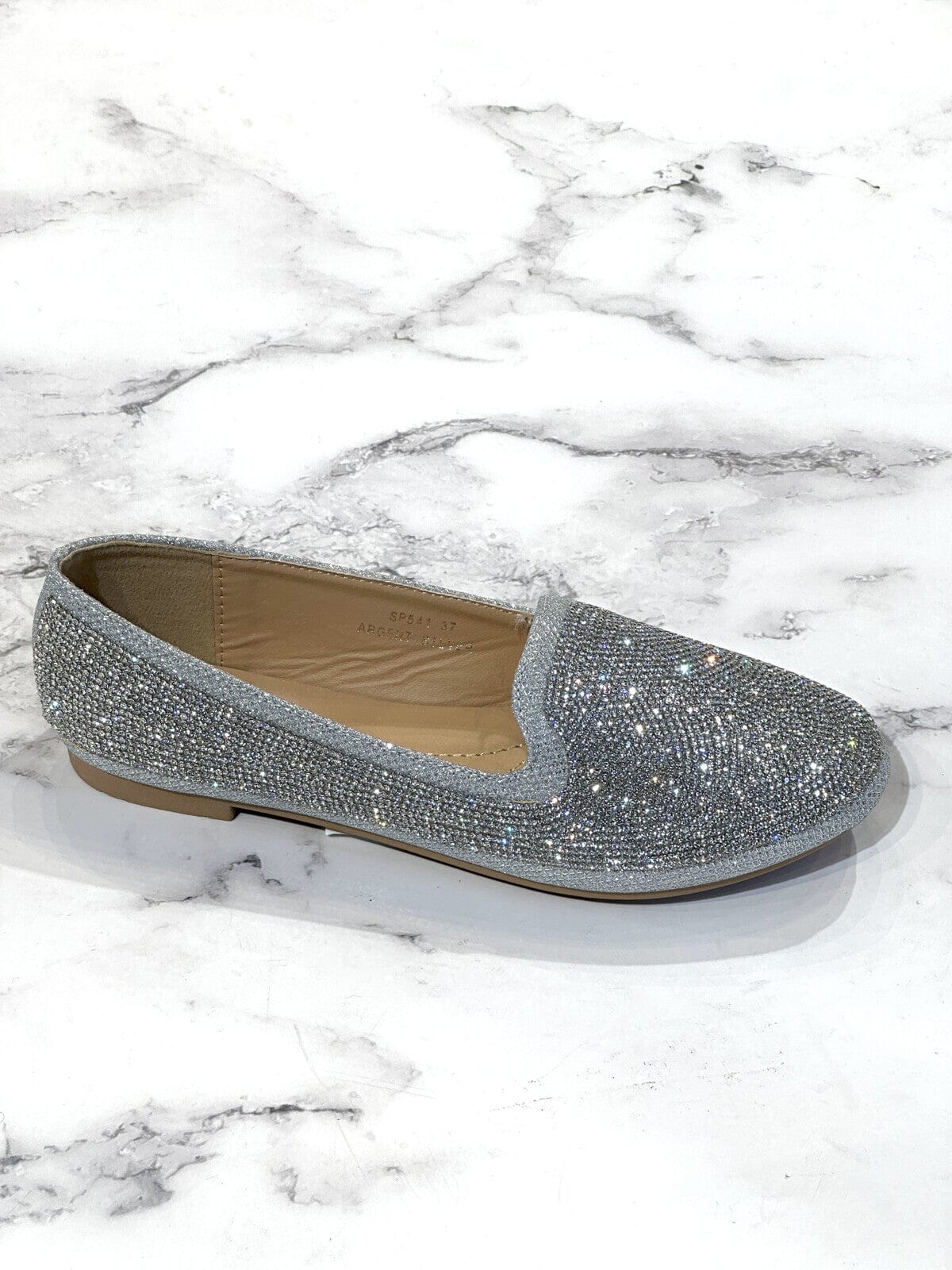 Sølvfargede ballerinasko fra Bloom med glitrende paljetter over hele overdelen. Den runde tåen og flate hælen gjør skoene enkle å gå i.