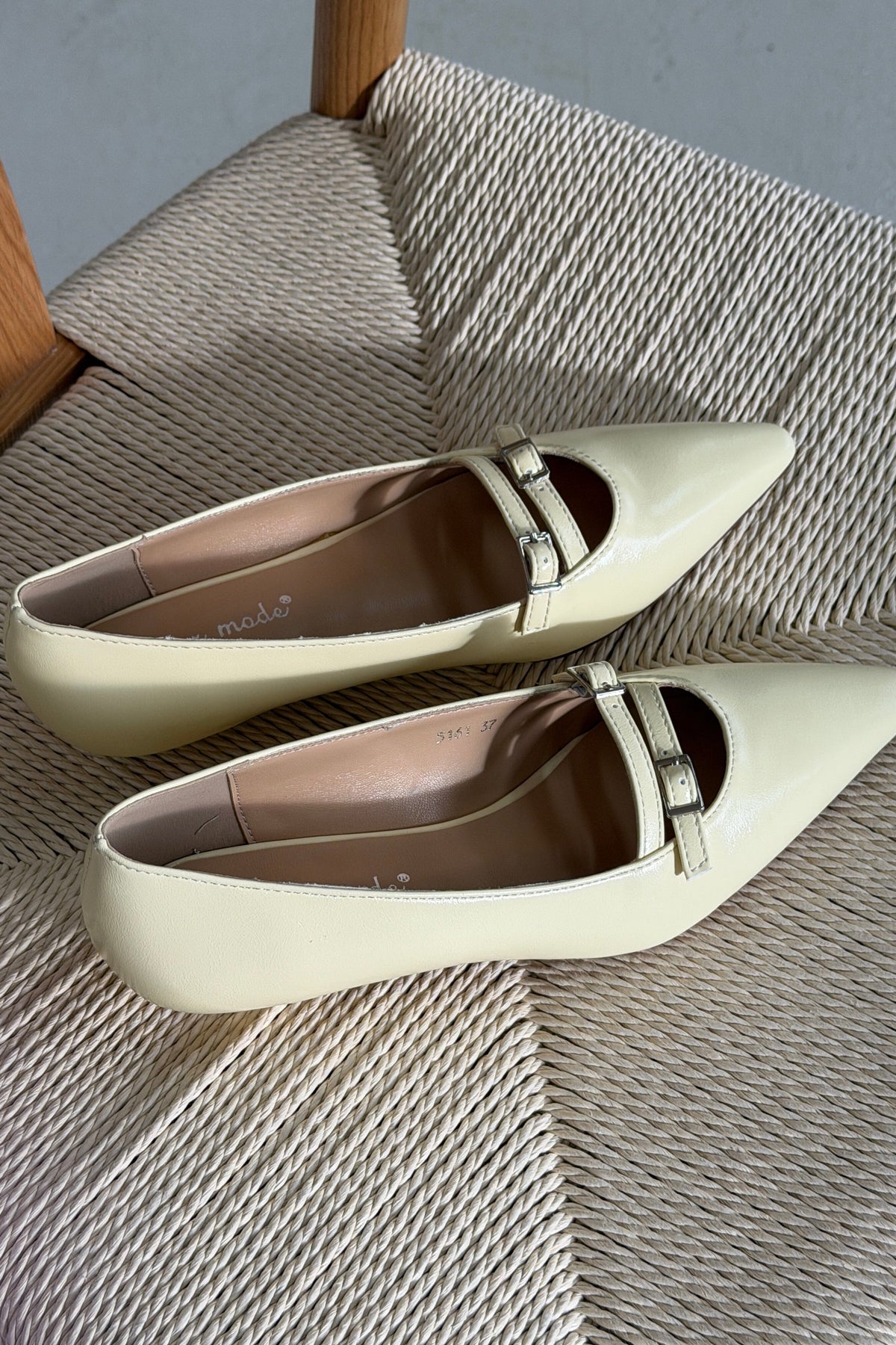 Lysgule ballerinasko fra Bloom med spiss tå og en dekorativ rem med spenne. Skoene er laget av syntetisk materiale.