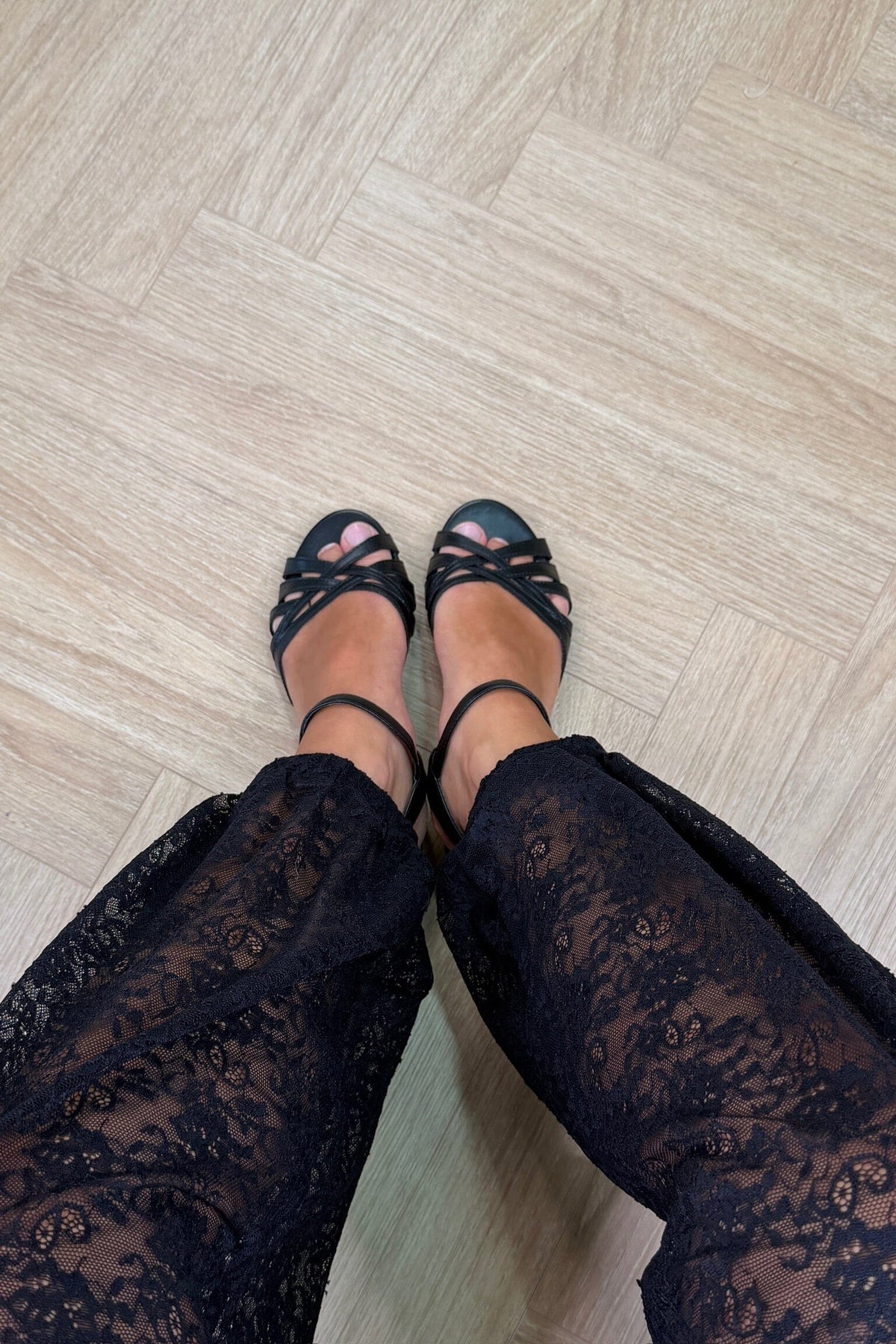 Svarte sandaler fra Bloom, laget av syntetisk materiale. Sandalene har kryssede stropper foran, en blokkhæl og en ankelrem med spenne.