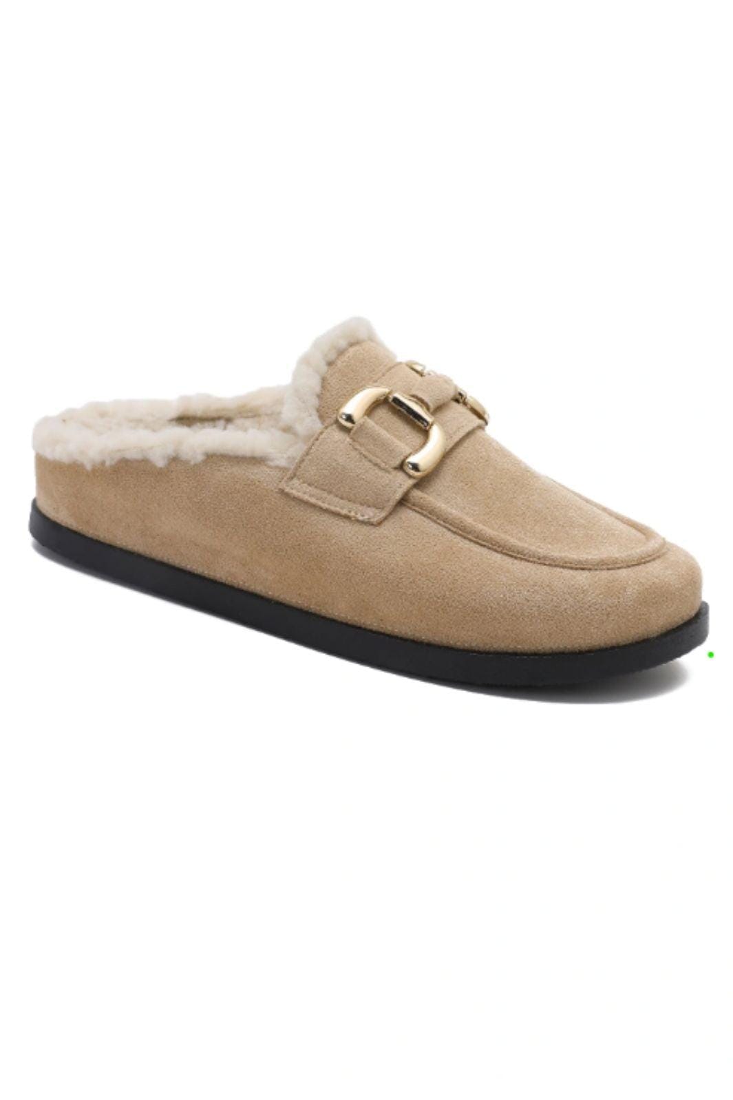 Tøfler fra Bloom i taupe med gyllent spenne på oversiden. Den hvite, myke plysjforingen og den sorte sålen gir en praktisk kombinasjon av komfort og holdbarhet.