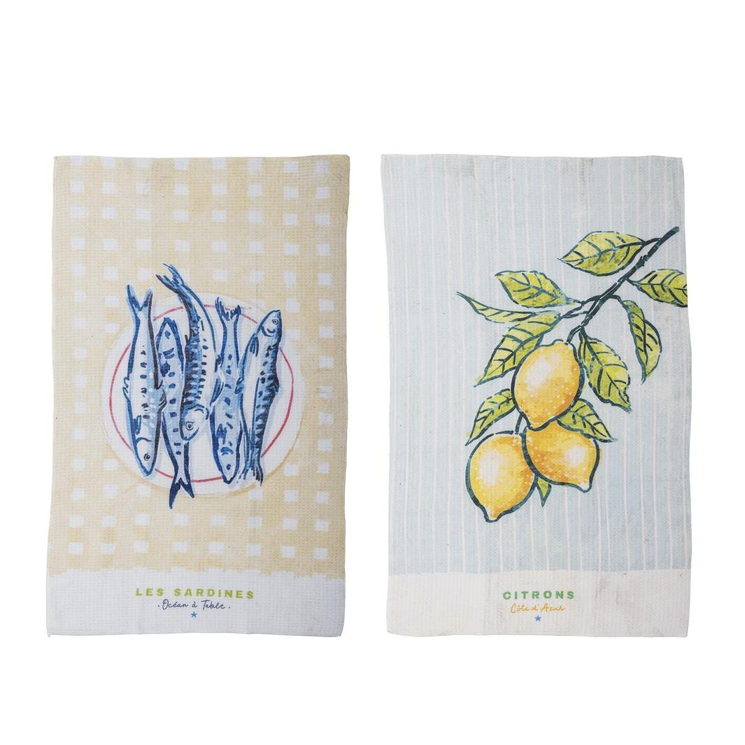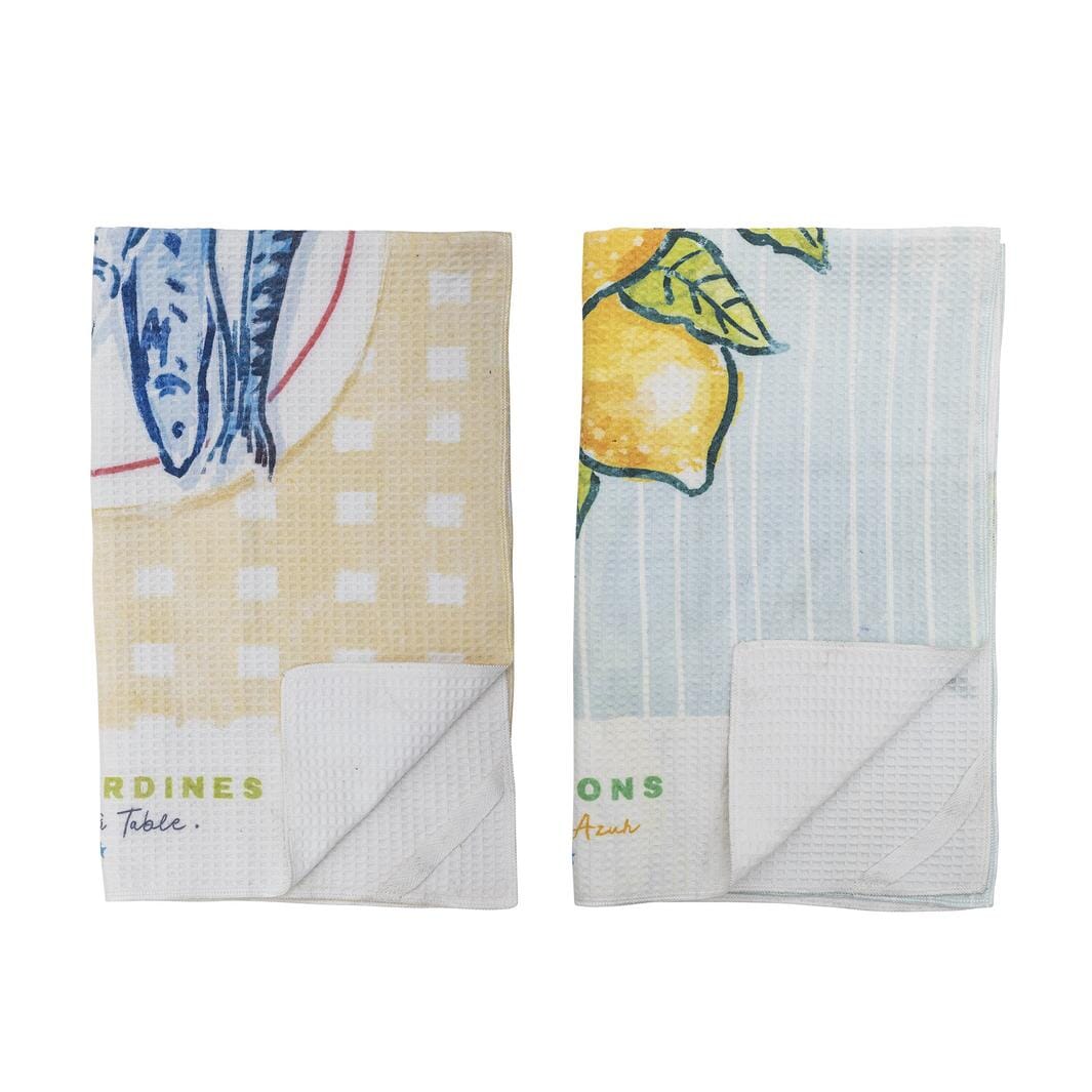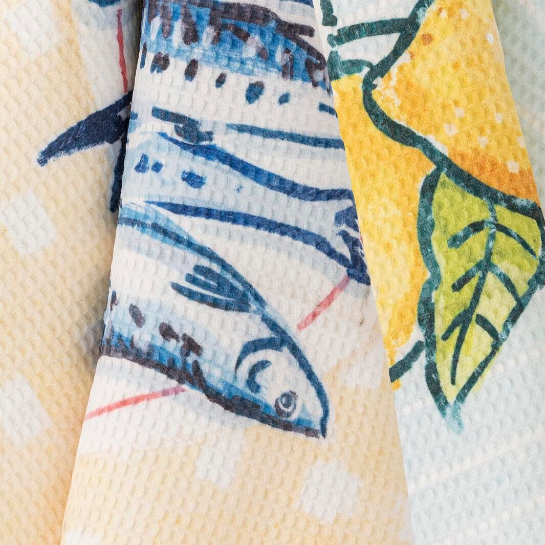 Kjøkkenhåndklær fra Bloomingville med middelhavsinspirerte motiver av fisk og sitroner. Mikrofibermaterialet gir rask tørketid og god absorpsjon.