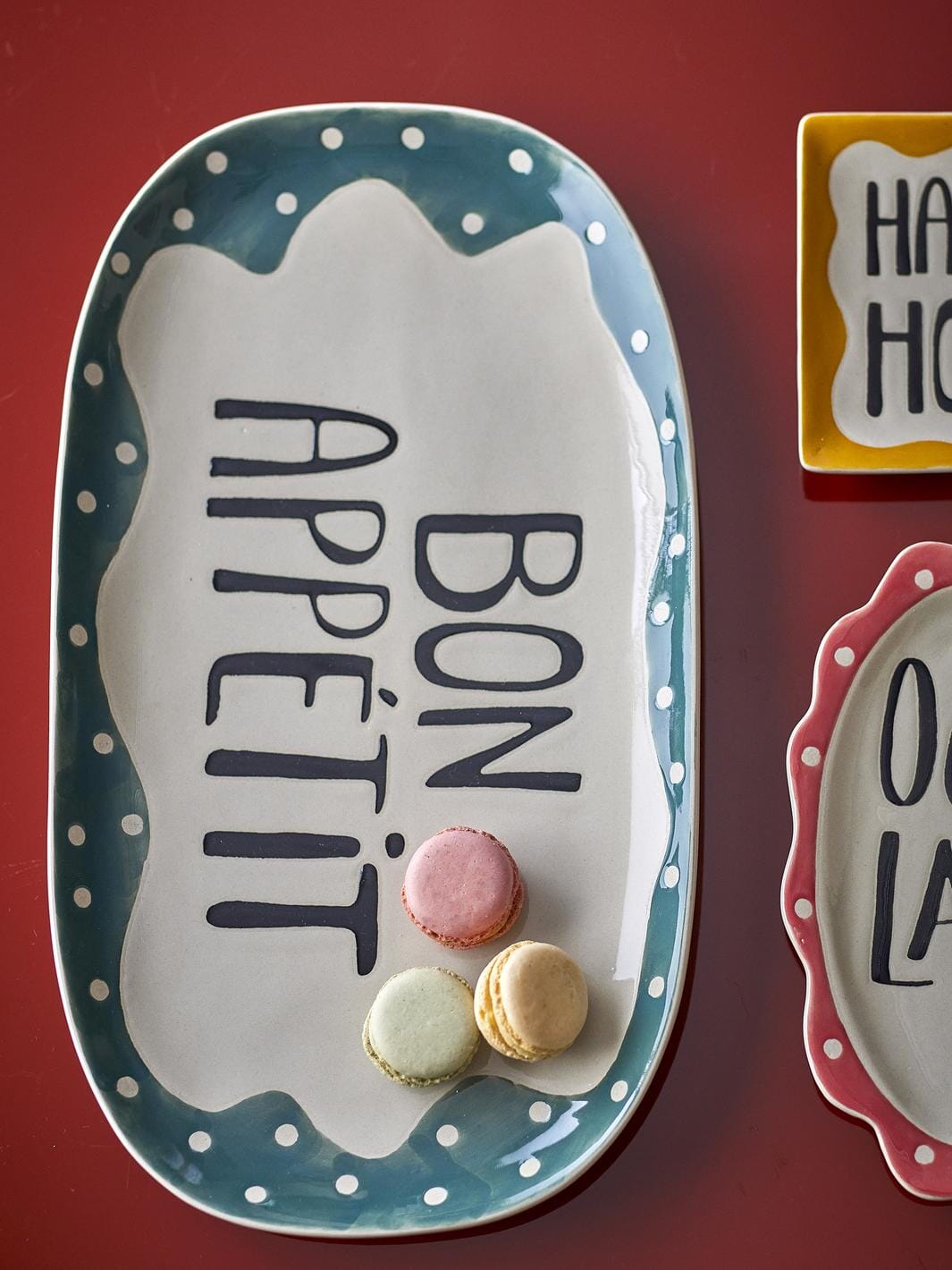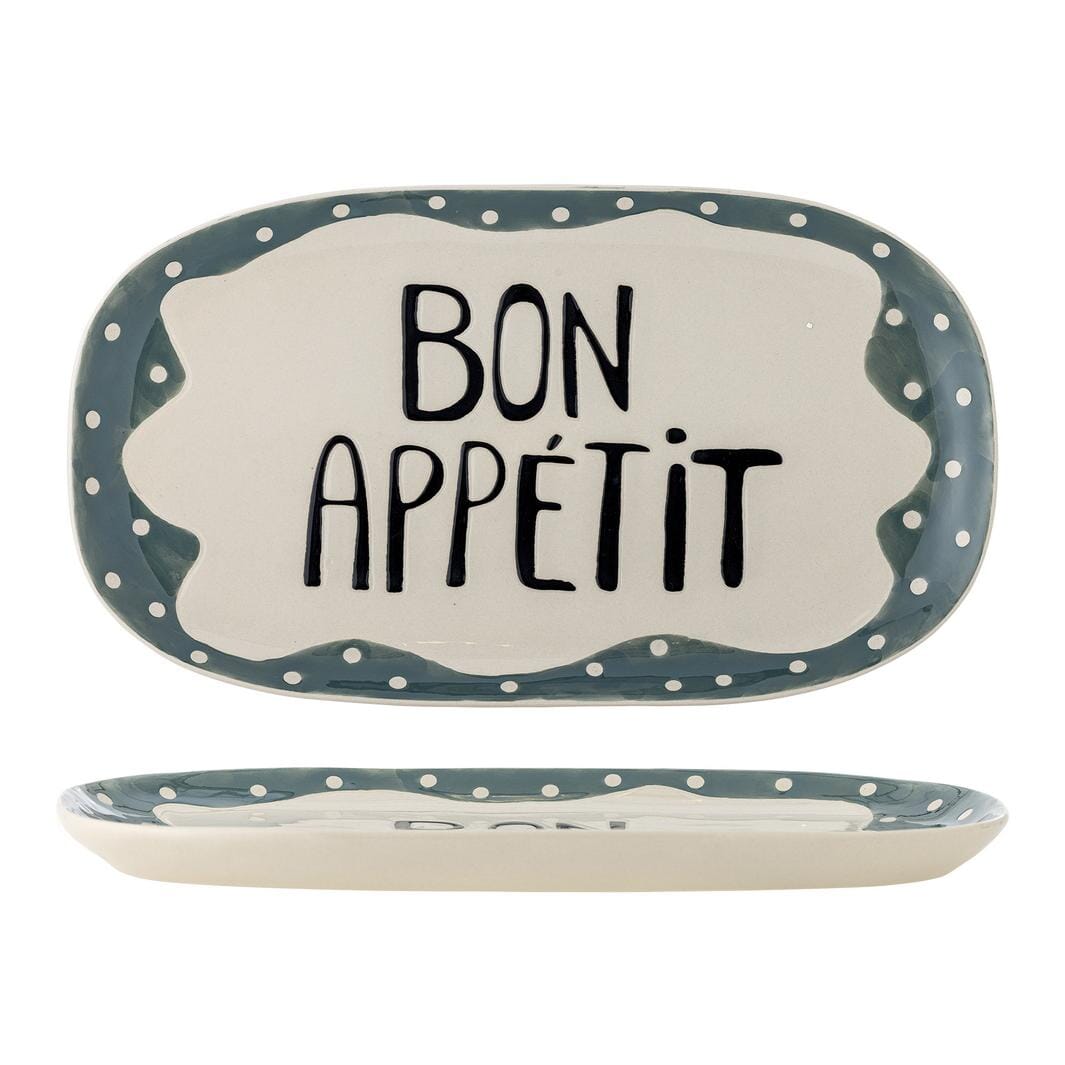 Serveringsfat fra Bloomingville, laget av steintøy. Håndmalte detaljer med teksten Bon Appétit i midten. Kanten har myke linjer og små hvite prikker på en blågrønn bunn.