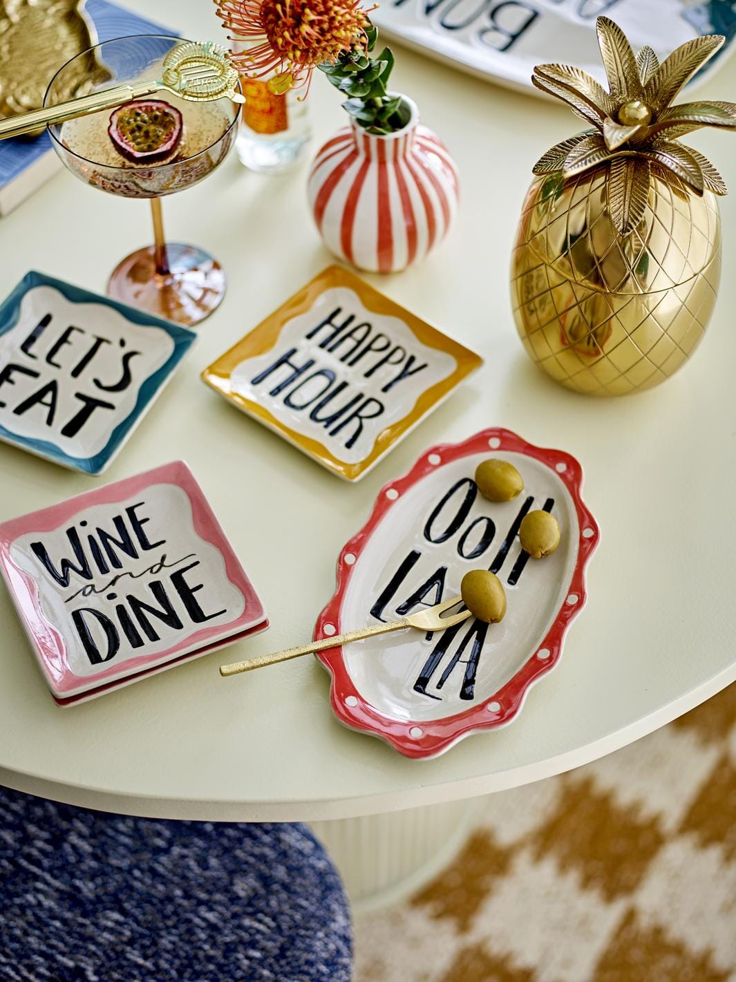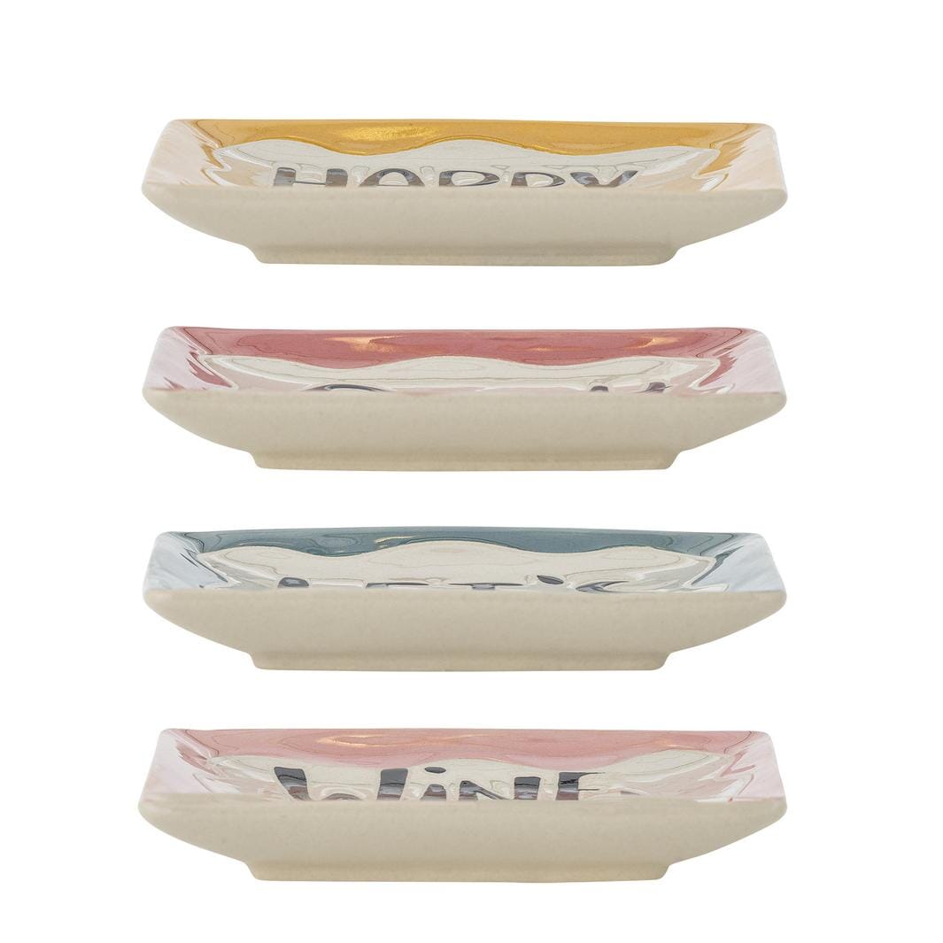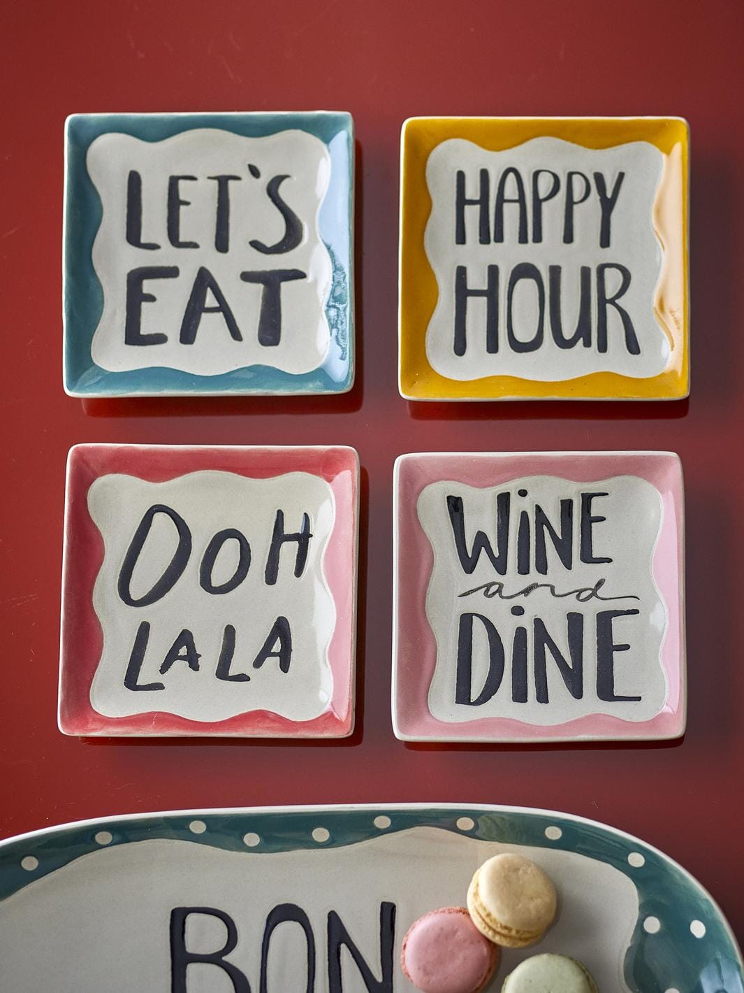 Rektangulære tallerkener fra Bloomingville i steingods med håndmalte overflater. Hver tallerken har et kremfarget felt i midten og fargede kanter i rosa, gult, blått eller rødt.