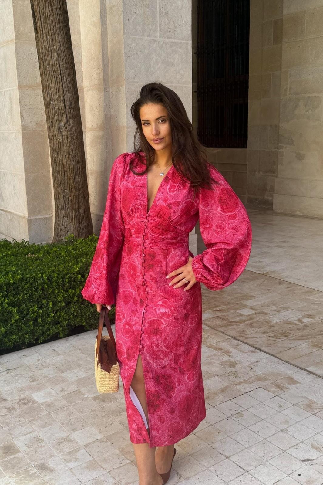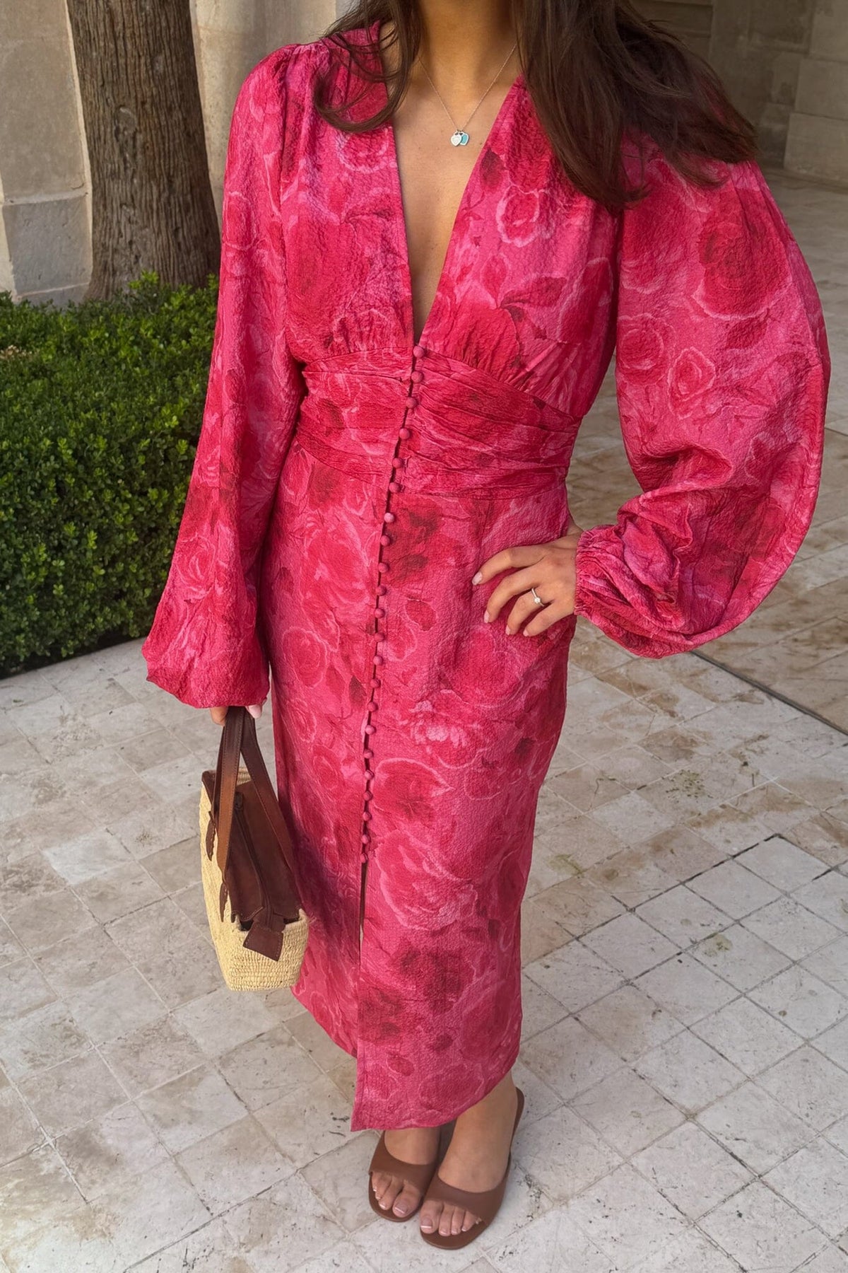 Lang kjole fra BYIC med et rosa roseprint. Kjolen har lange ermer med lett puff og en V-utringning med stofftrukne knapper foran.