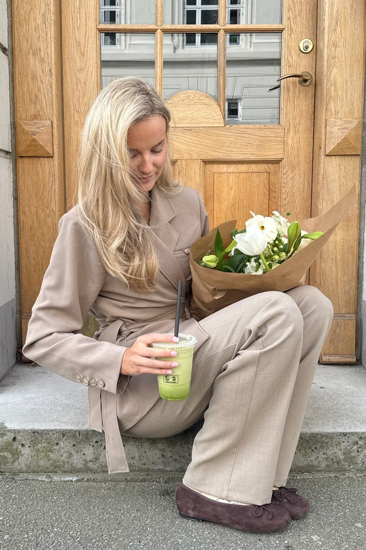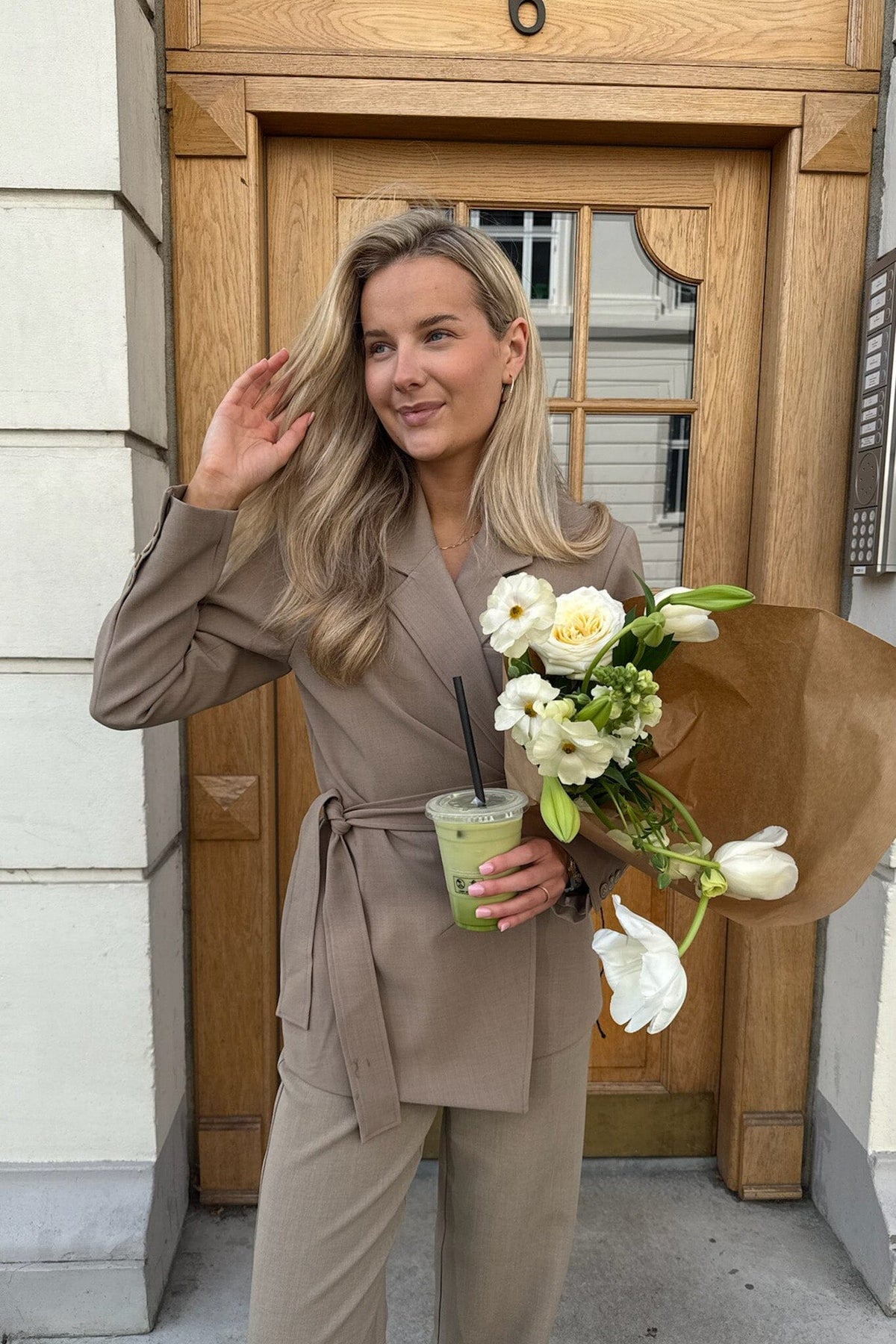 Lys brun blazer fra BYIC med omslagsdesign og belte i midjen. Blazeren har skulderputer, rette ermer og en liten brystlomme på venstre side.