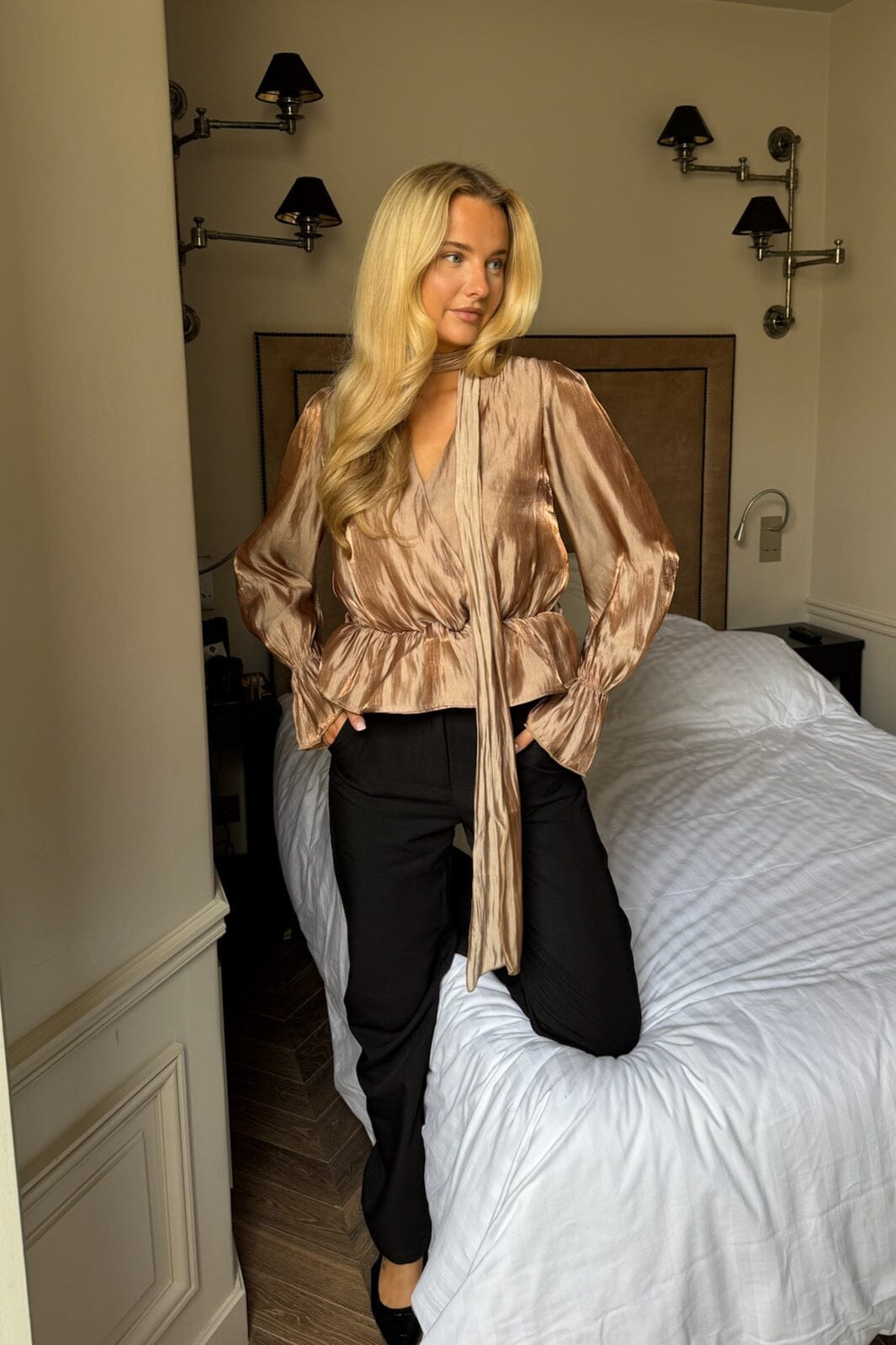 Blusen har en avslappet passform med en markert midje, lange ermer og en dyp V-utringning med en omslagsdetalj og fine volanger.