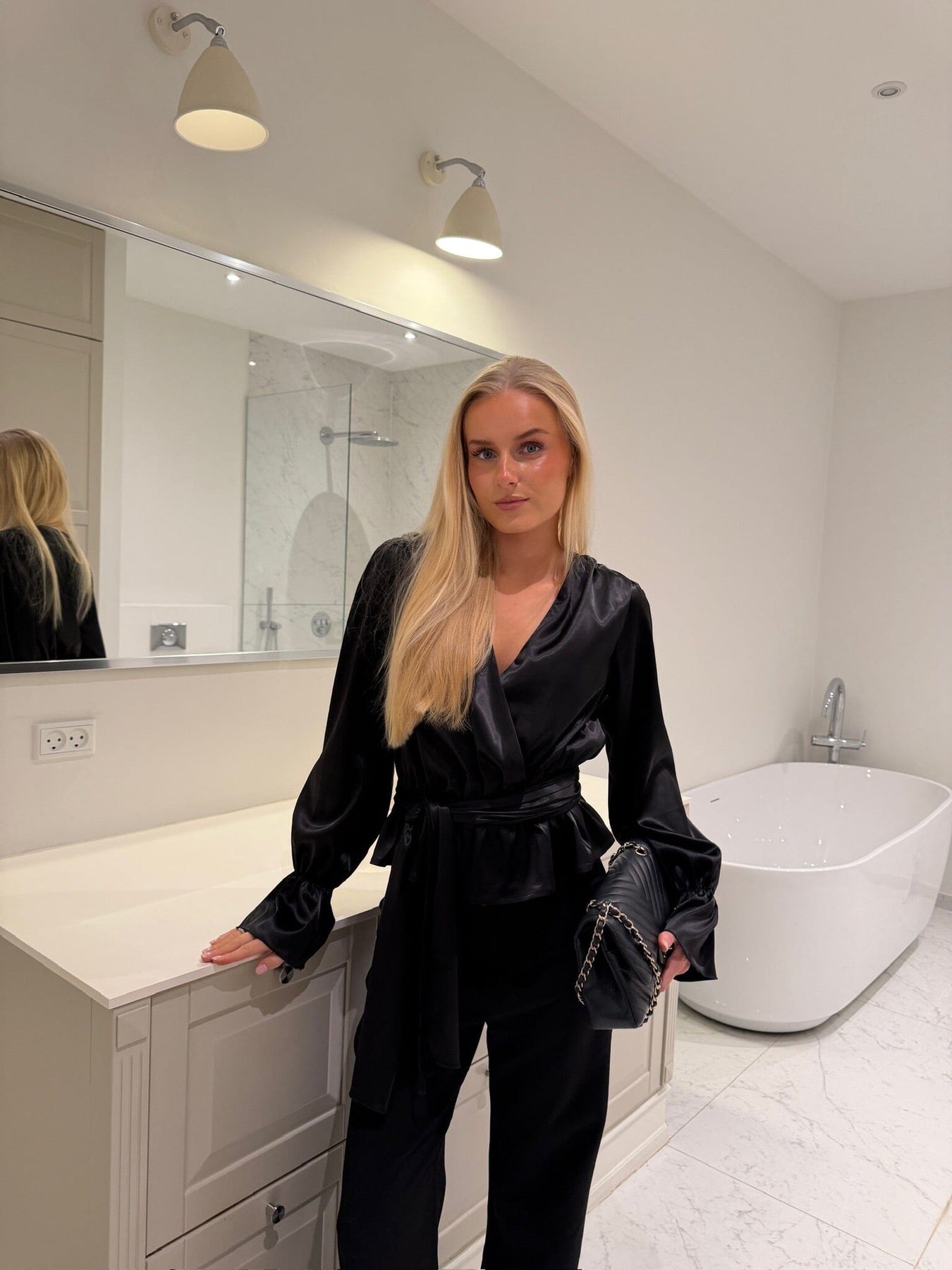 Svart satengskjorte fra BYIC med V-utringning og knytebånd. Skjorten har en løs passform med markert midje og puffede ermer med elastiske mansjetter.