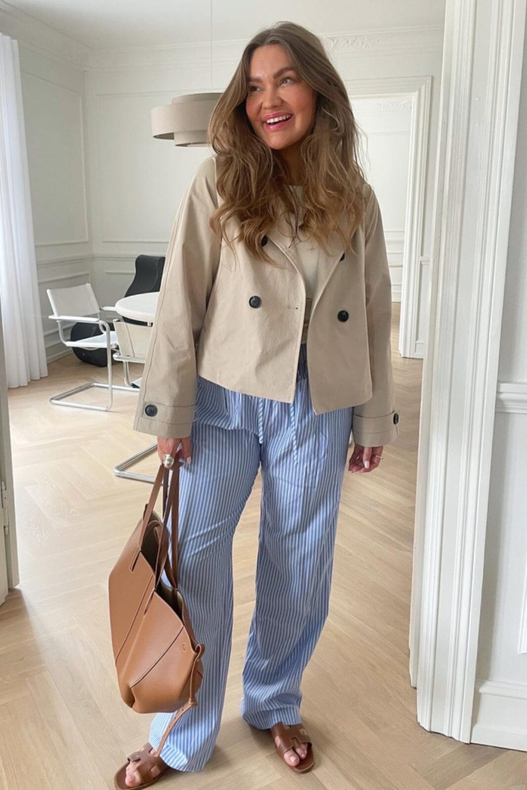 Blå og hvidstribede bukser med lommer på hver side og har et almindeligt bælte omkring taljen.