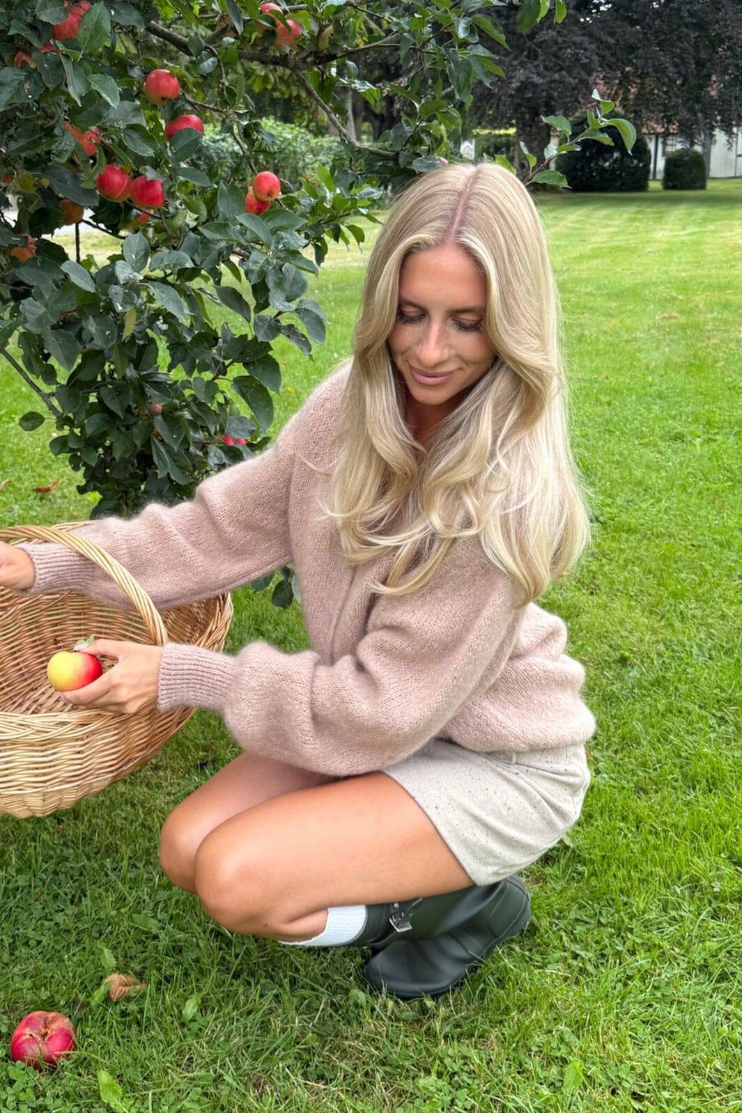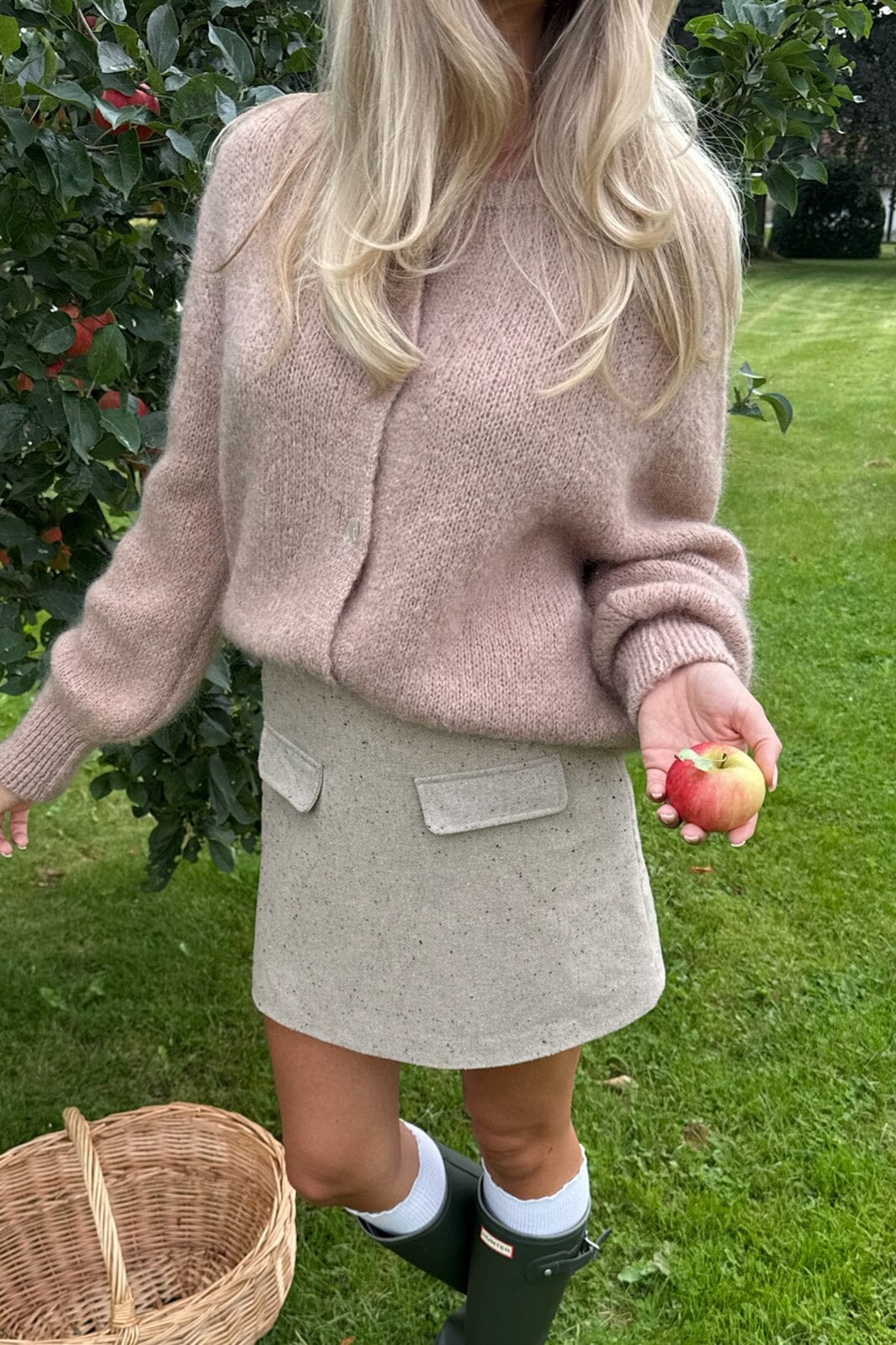 Mørk beige cardigan fra BYIC med løs passform. Den er strikket i en myk mohairblanding og har perleknapper foran. Ribkanter ved ermene gir et klassisk uttrykk.