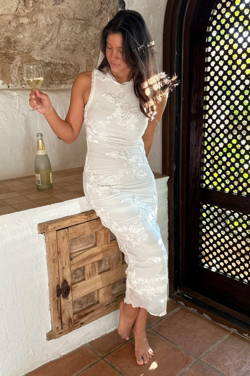 Hvit mesh-kjole fra BYIC med broderte 3D-blomster og rynkedetaljer på sidene. Kjolen har en tettsittende passform og små volanger ved skuldrene.