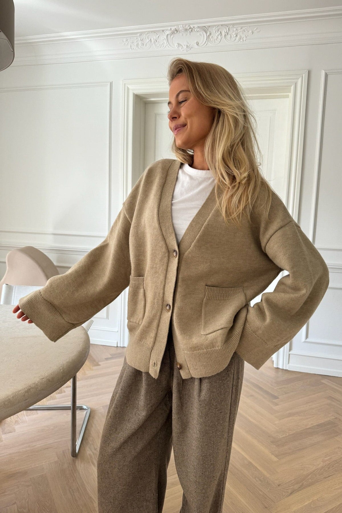 Beige cardigan fra BYIC i strikk med brede ermer og V-hals. Cardiganen har synlige knapper og to lommer foran. Den enkle stilen gjør den lett å kombinere med annet tøy.