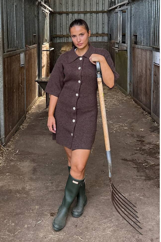 Mørkebrun strikkekjole fra BYIC med skjortekrage og knapper hele veien ned. Den har 3/4-ermer og en rett snitt som går til midten av låret.