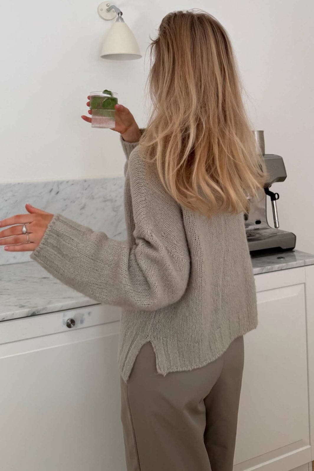 Beige genser fra BYIC med løs passform og lange ermer. Den er strikket i en myk blanding av mohair og ull med ribbekanter ved ermene og bunnen.