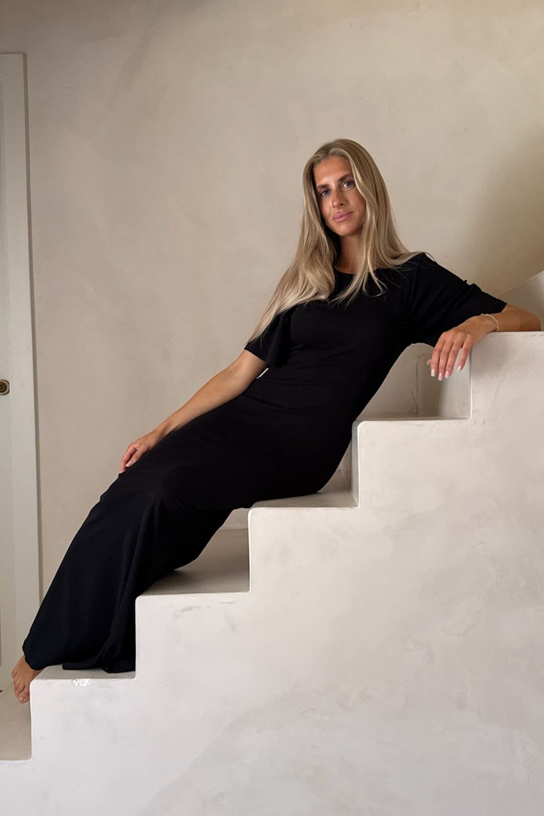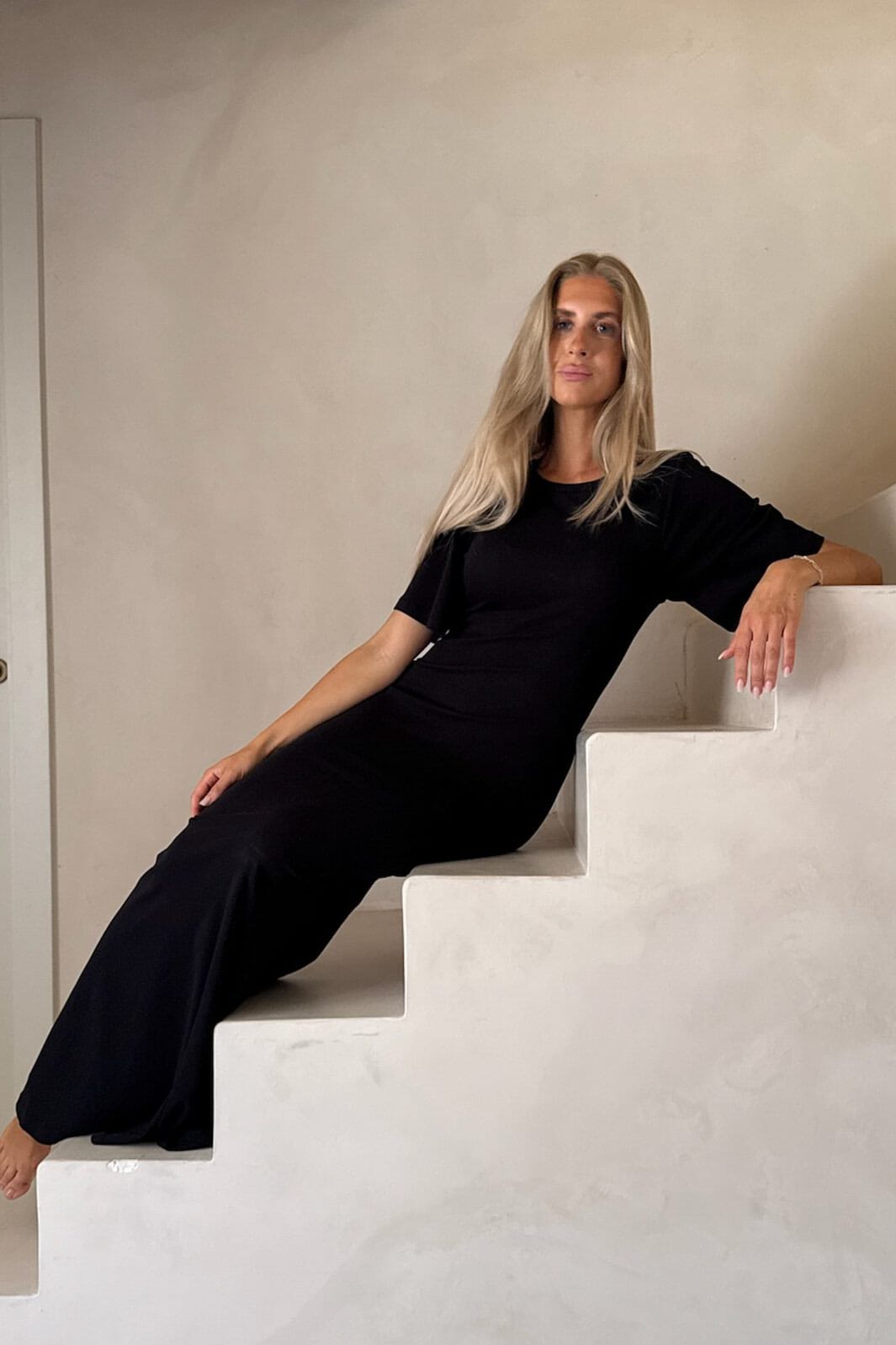 Svart T-skjortekjole fra BYIC med korte ermer og rund halsutskjæring. Den tettsittende silhuetten og gulvlengden gir kjolen et stilrent uttrykk.
