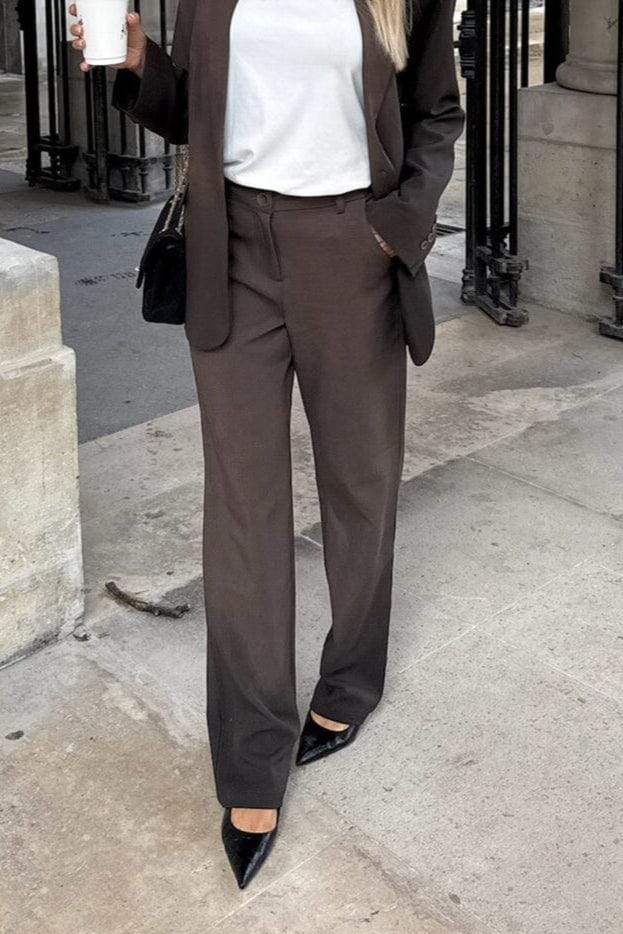 Mørkebrune bukser fra BYIC med rett snitt og høy midje. Buksene har beltestropper i midjen samt knapp- og glidelåslukking foran.