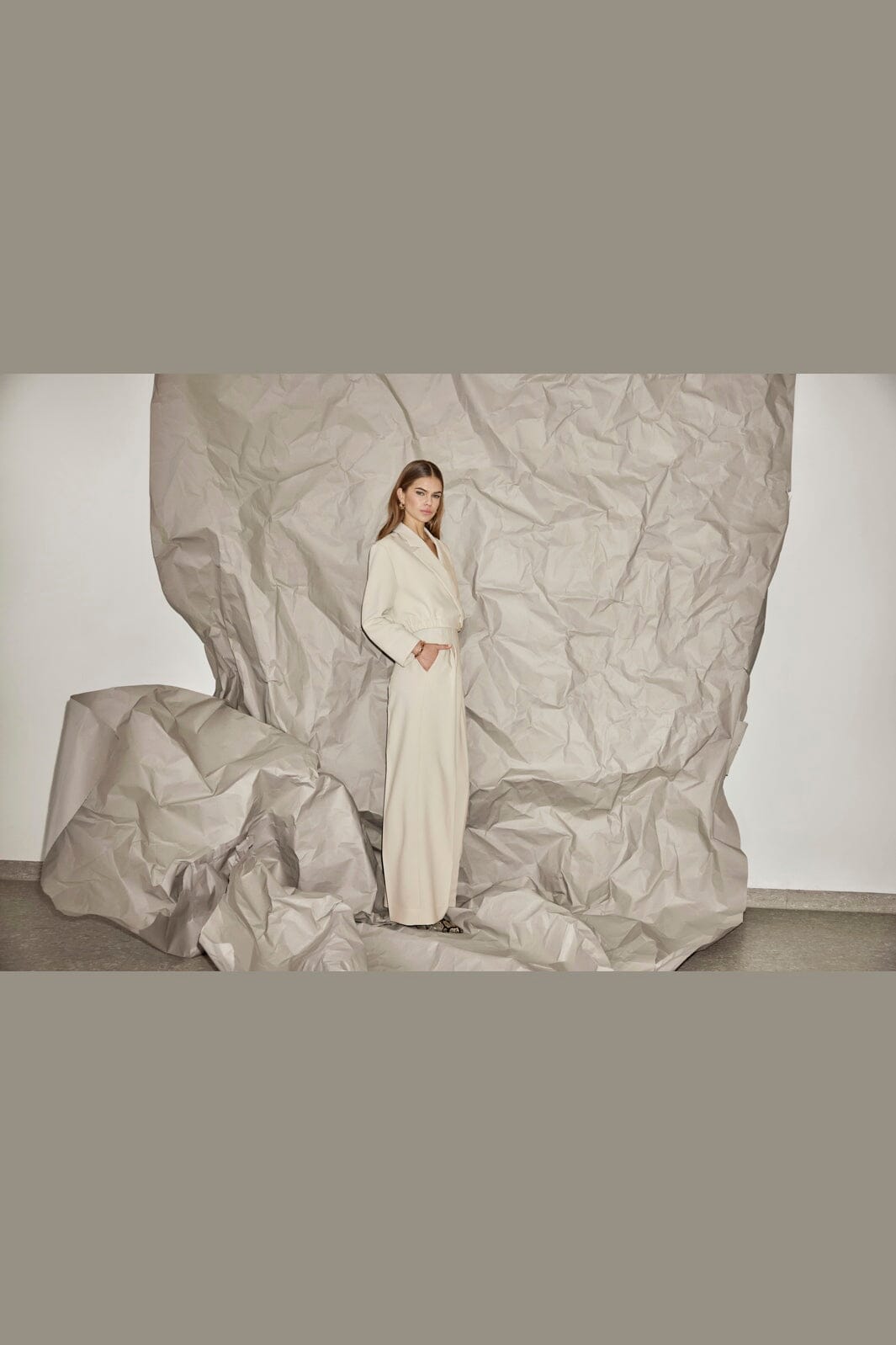 Cropped blazer fra Co´Couture i en lys beige nyanse. Blazeren har volanger, klassisk skjortekrage og lange ermer med en regular fit.