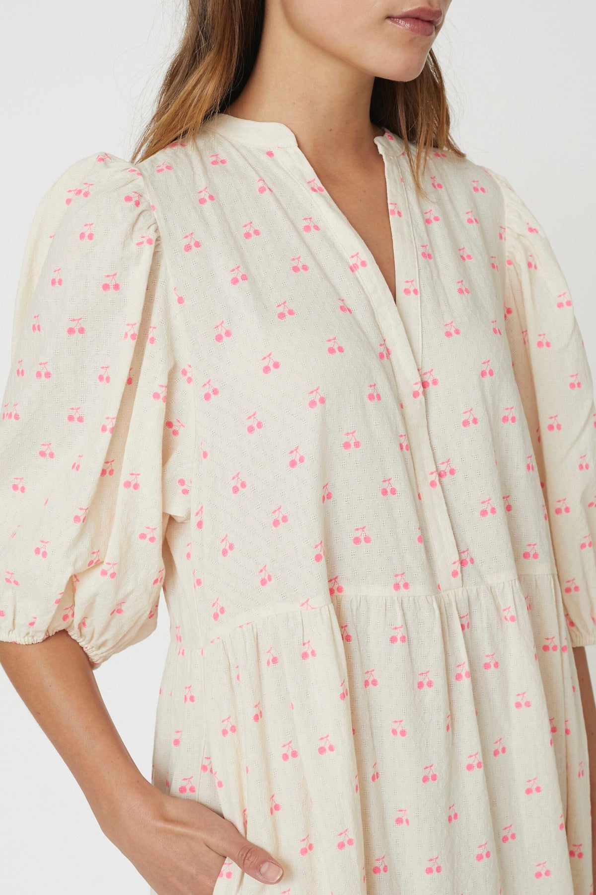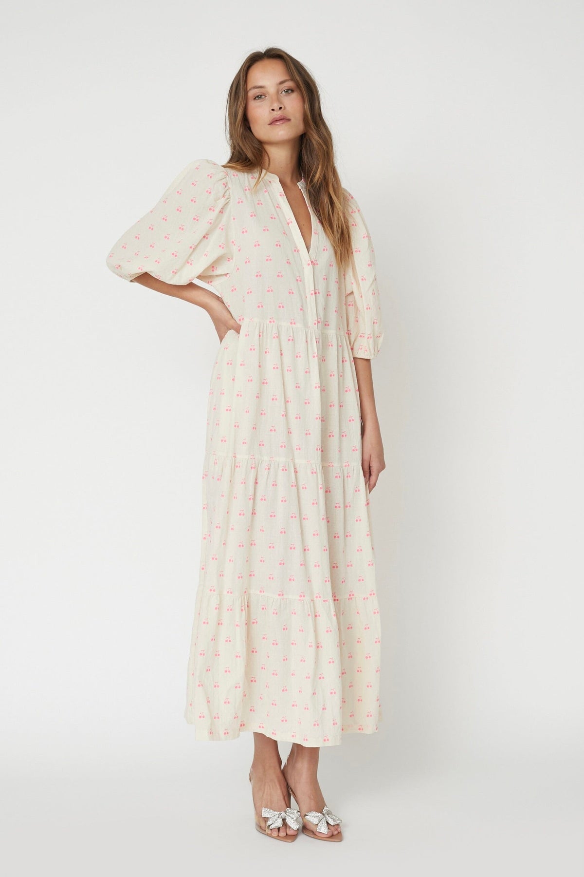 Gulvlengde kjole fra Co'Couture med beige bunn og neongrønt kirsebærmønster. Kjolen har V-hals med volanger og 3/4 puffede ermer.