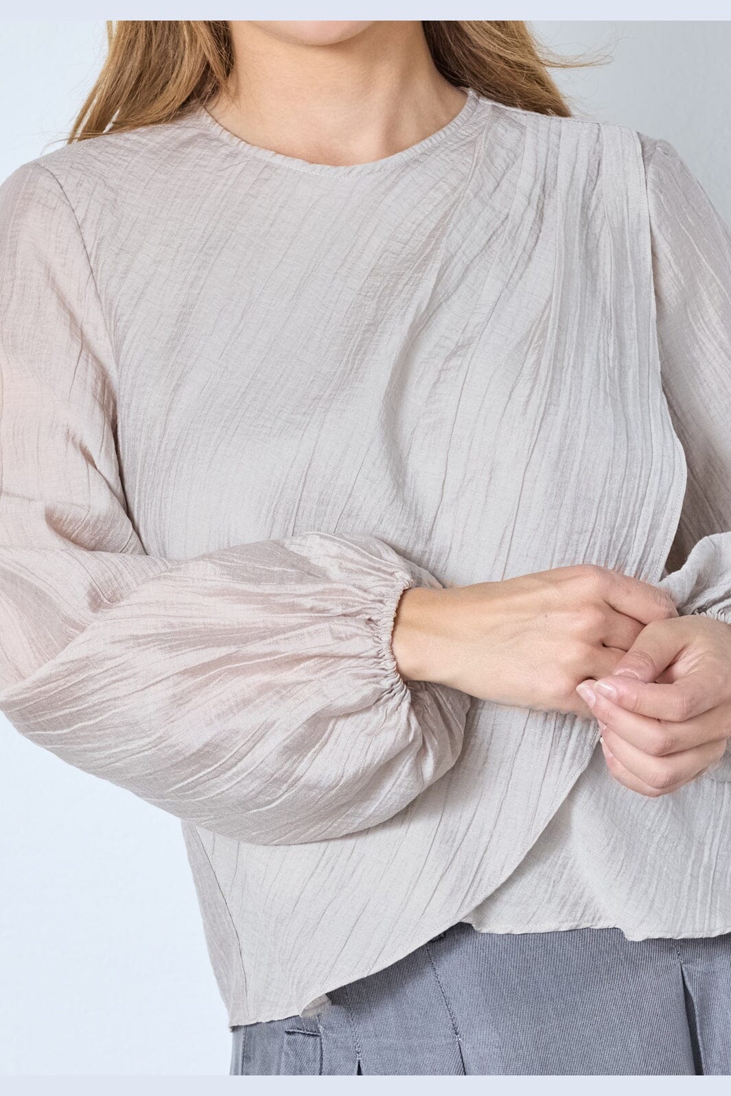Bluse fra Co´Couture i beige-brun nyanse med drapert front. Blusen har lange ermer og en løs passform.