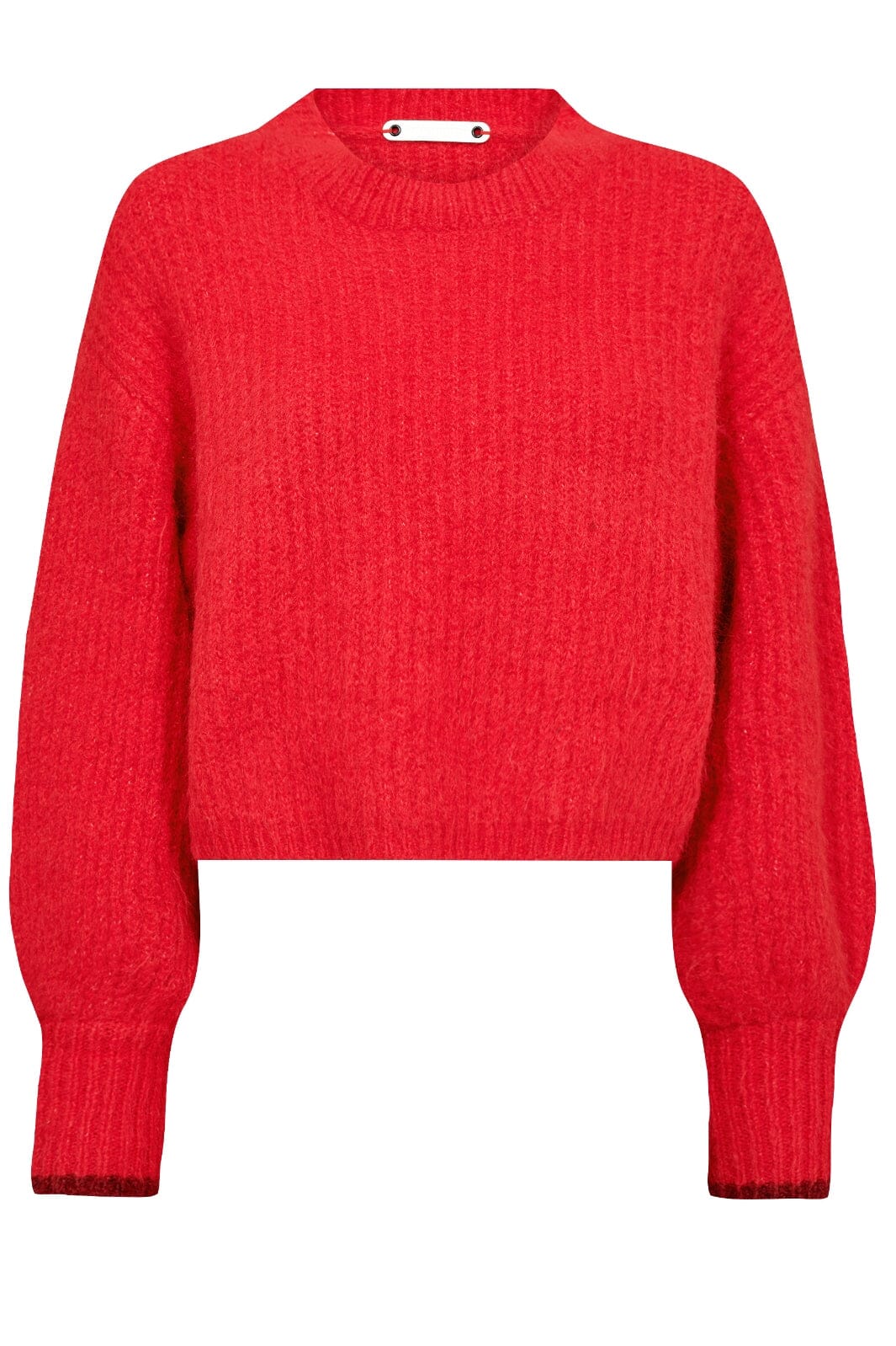 Rød cropped strikkegenser fra Co´couture i ribbestrikk. Den korte lengden og den klare røde fargen gir genseren et friskt uttrykk. Rund hals og lange ermer.