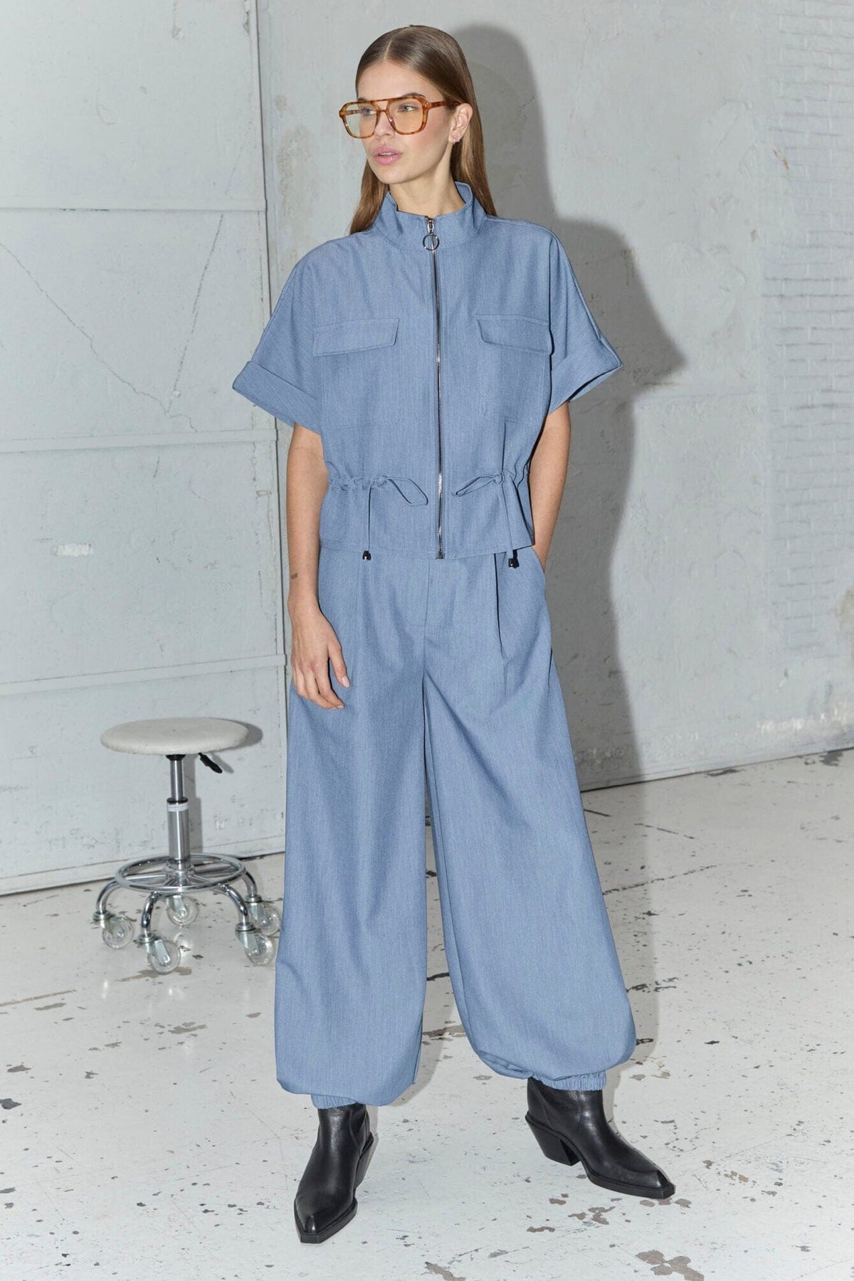 Støvete blå vest fra Co´Couture, laget av en blanding av polyester, viskose og elastan. Vesten har glidelåslukking foran og snøring i midjen.