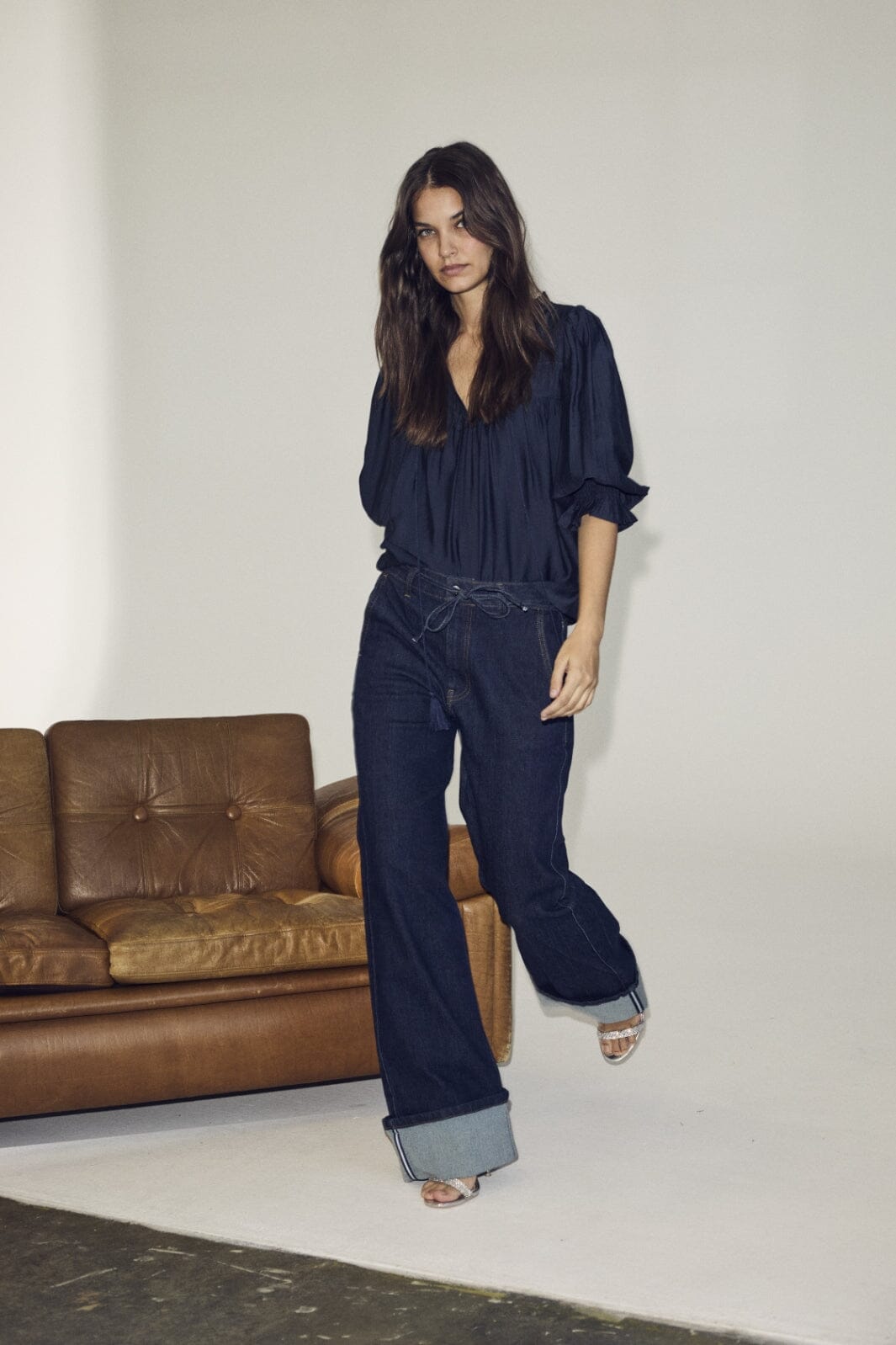 Mørkeblå bluse fra Co´couture med pufferm og blondedetaljer. Blusen har en V-utringning og snøring med kvaster, som gir den et lett og luftig uttrykk.