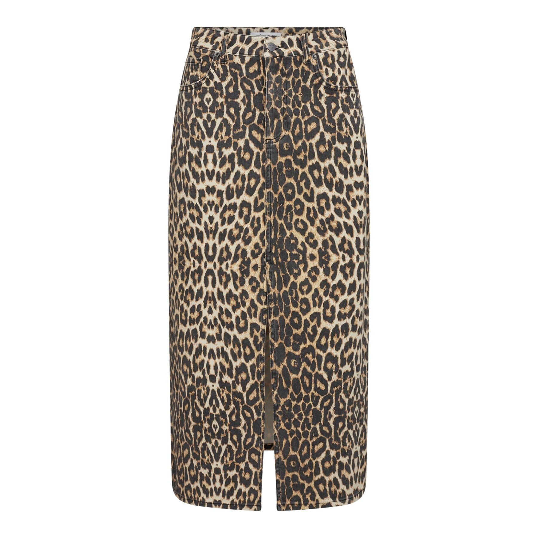 Denimskjørt i khaki med leopardmønster og frontslitt. Den lange modellen når til midt på leggen og har snøring i livet som gir mulighet for å justere passformen.