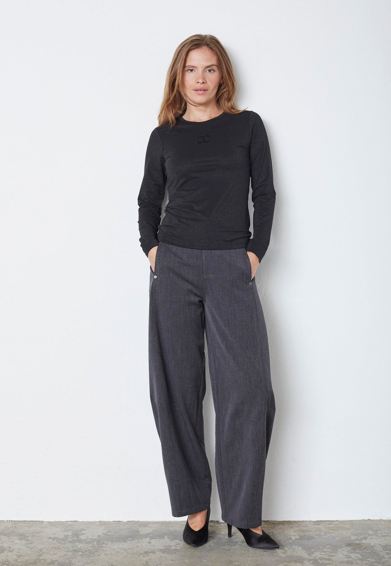 Svart langermet t-skjorte fra Co'Couture med skinnende overflate. Den har broderi på brystet og dekorative sømmer som gir t-skjorten et særpreg. Rund halsutskjæring og rett snitt.