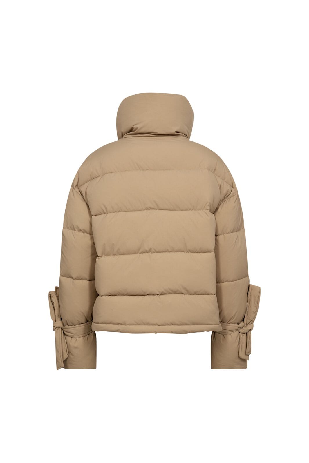 Khakifarget pufferjakke fra Co'Couture med kort lengde og høy krage. Jakken har en oversized passform med quiltede seksjoner og trykknapper til lukking.