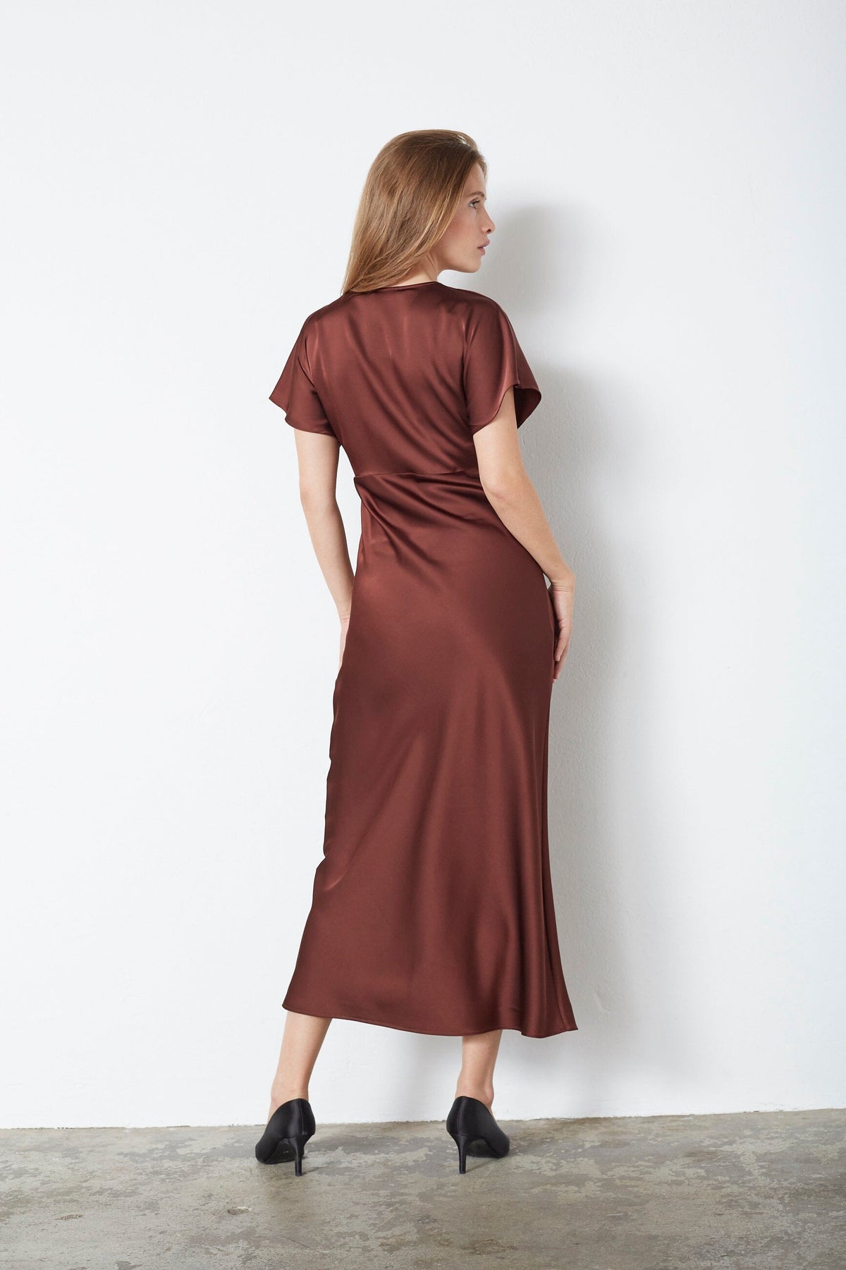 Mørkebrun kjole fra Co'Couture med V-utringning og korte ermer. Kjolen har en ankellang silhuett med volangdetaljer og er velegnet til både bryllup og andre festlige anledninger.