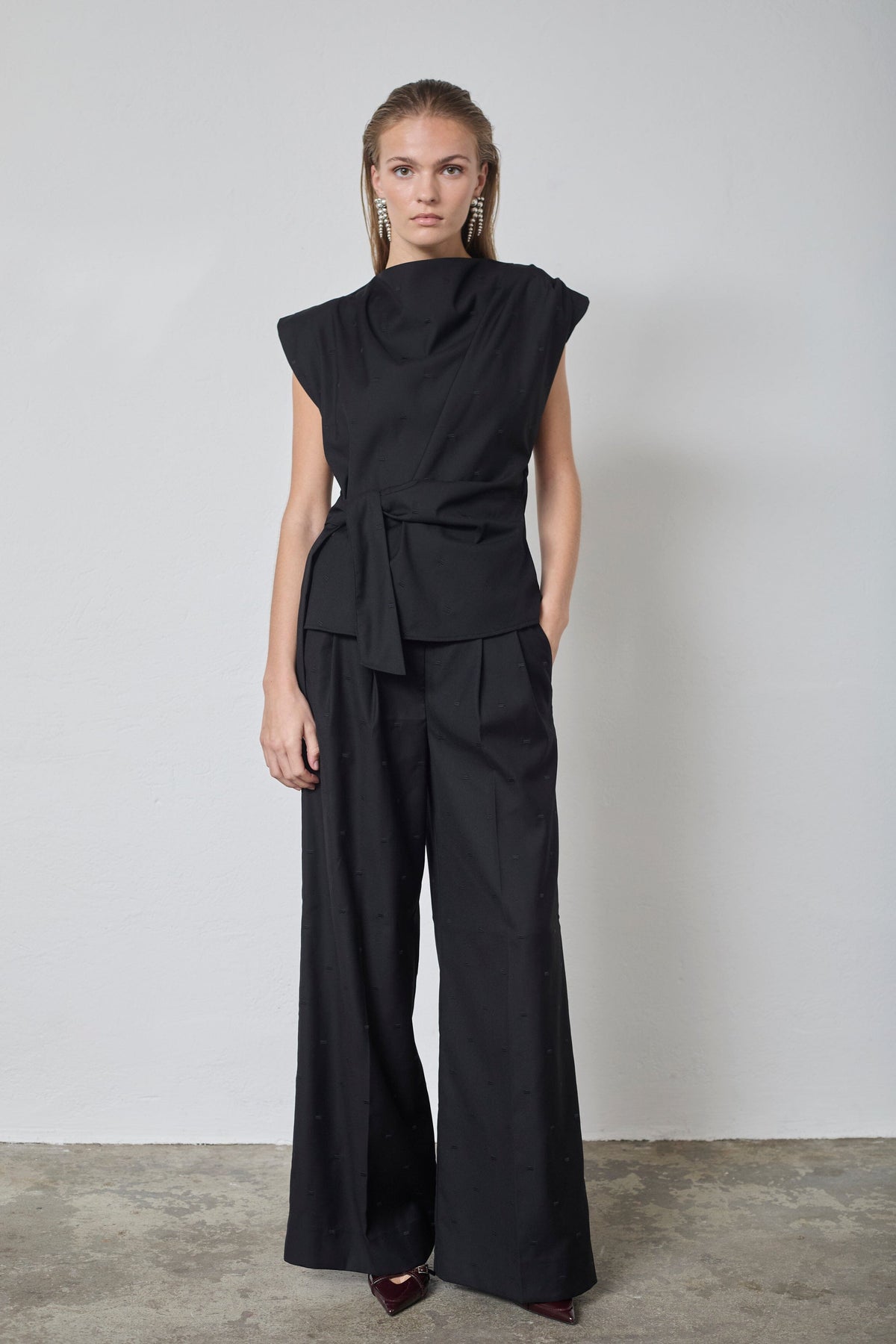 Sort plissert topp fra Co´Couture med strukturert skulderdesign og plissering foran. Toppen har brede skuldre og knytebelte i midjen.