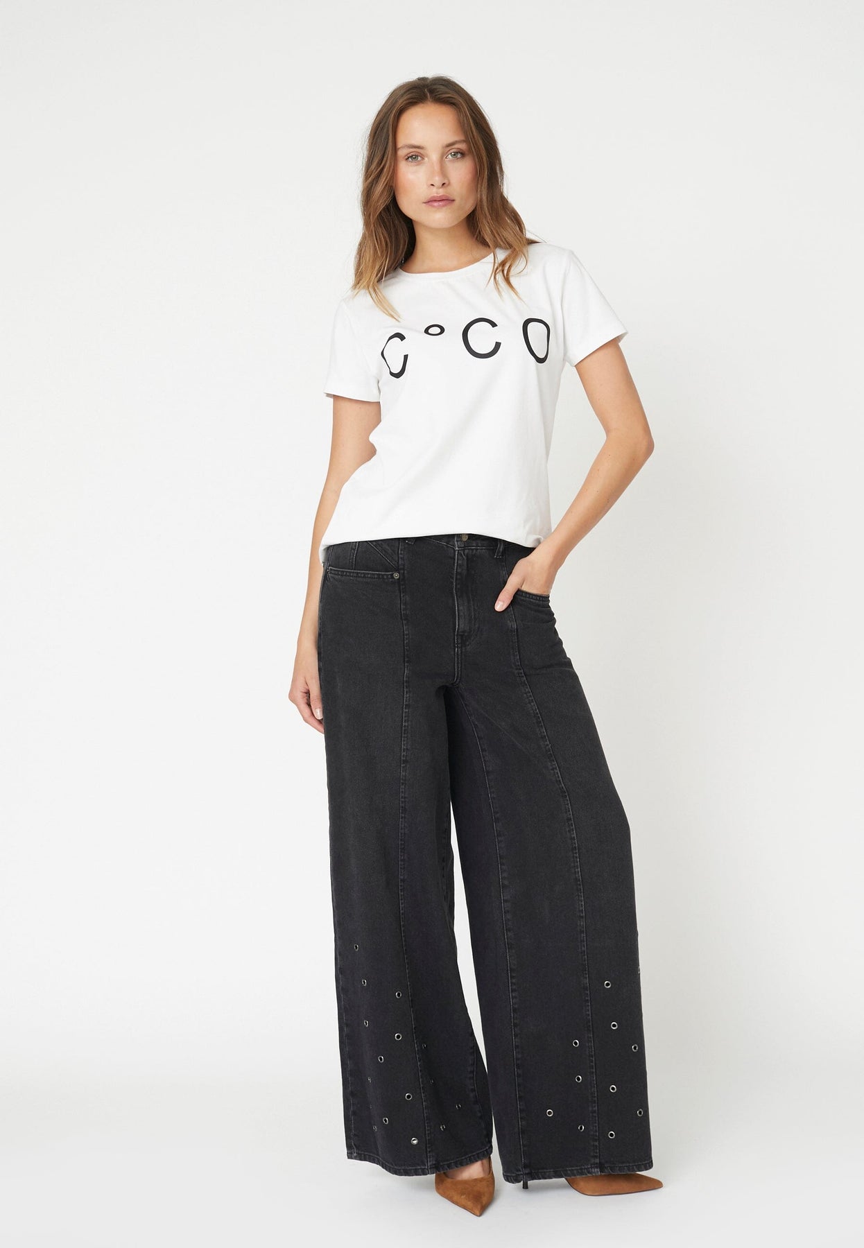 Hvit T-skjorte fra Co´Couture med svart print på fronten. T-skjorten er laget av 95 % bomull og 5 % elastan.
