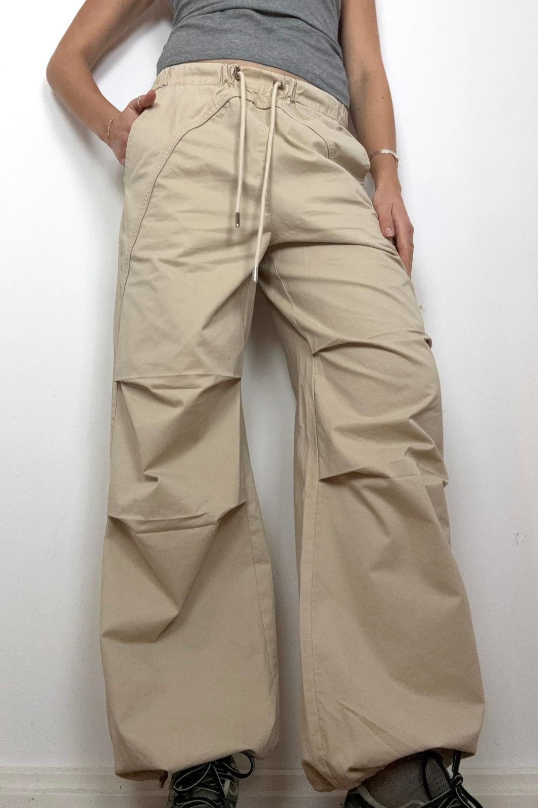Beige bukser fra Continue i en sandfarget nyanse. Buksene har en løs passform med dekorative sømmer og snøredetaljer i midjen.