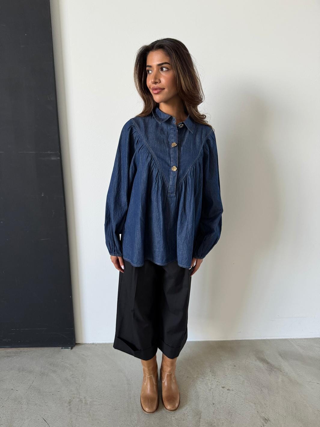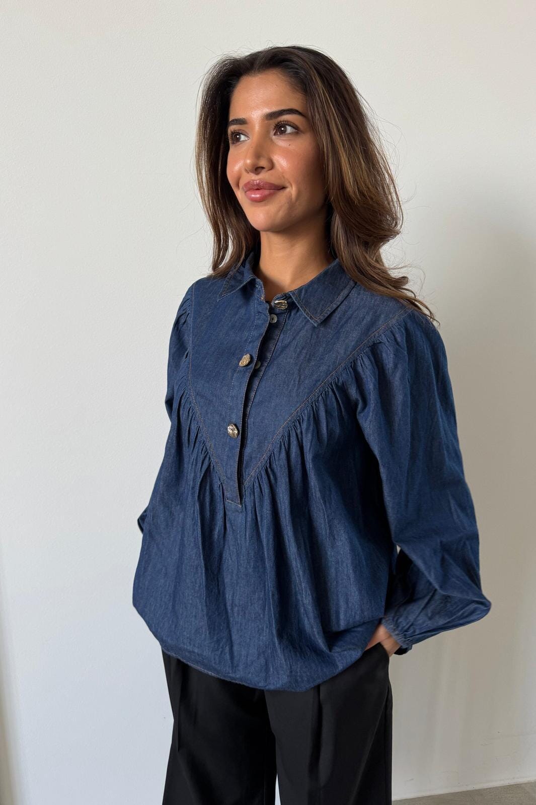 Blå bomullsbluse fra Continue med skjortekrage og knapper foran. Blusen har rynkede detaljer under bærestykket og dekorative sømmer som gir struktur til designet.