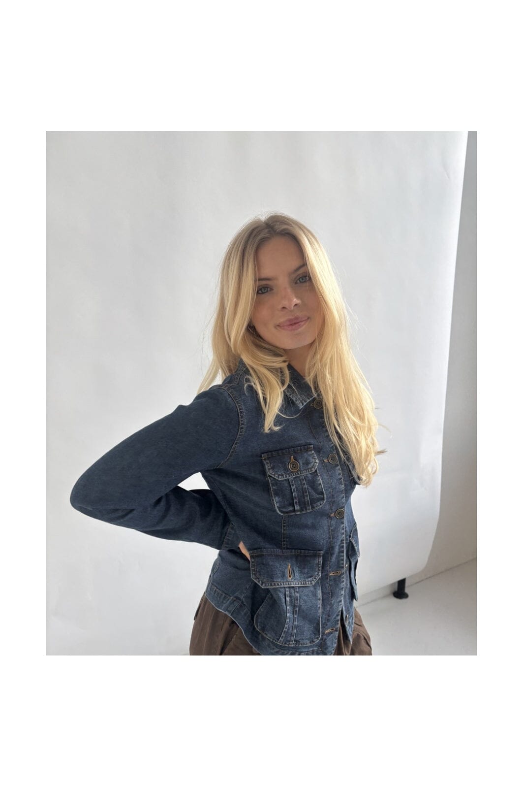 Denimjakke fra Continue i blå denim. Jakken har flere lommer på forsiden og en brodert detalj på ryggen.