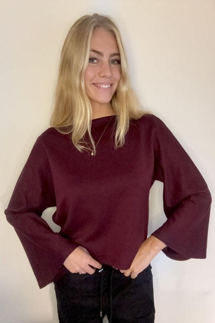 Bordeaux bluse fra Continue i en løs passform. Blusen har 3/4-ermer og en ensfarget overflate.