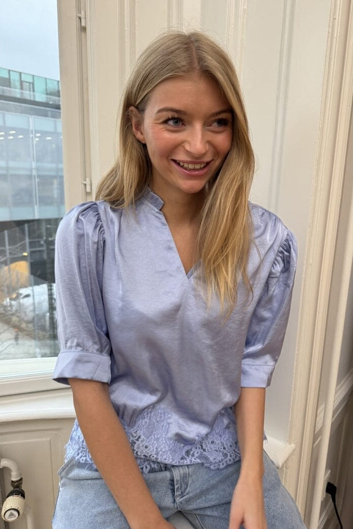 Lys blå bluse fra Continue, laget av polyester og viskose. Blusen har V-utringning, 3/4-ermer og blondedetaljer nederst.