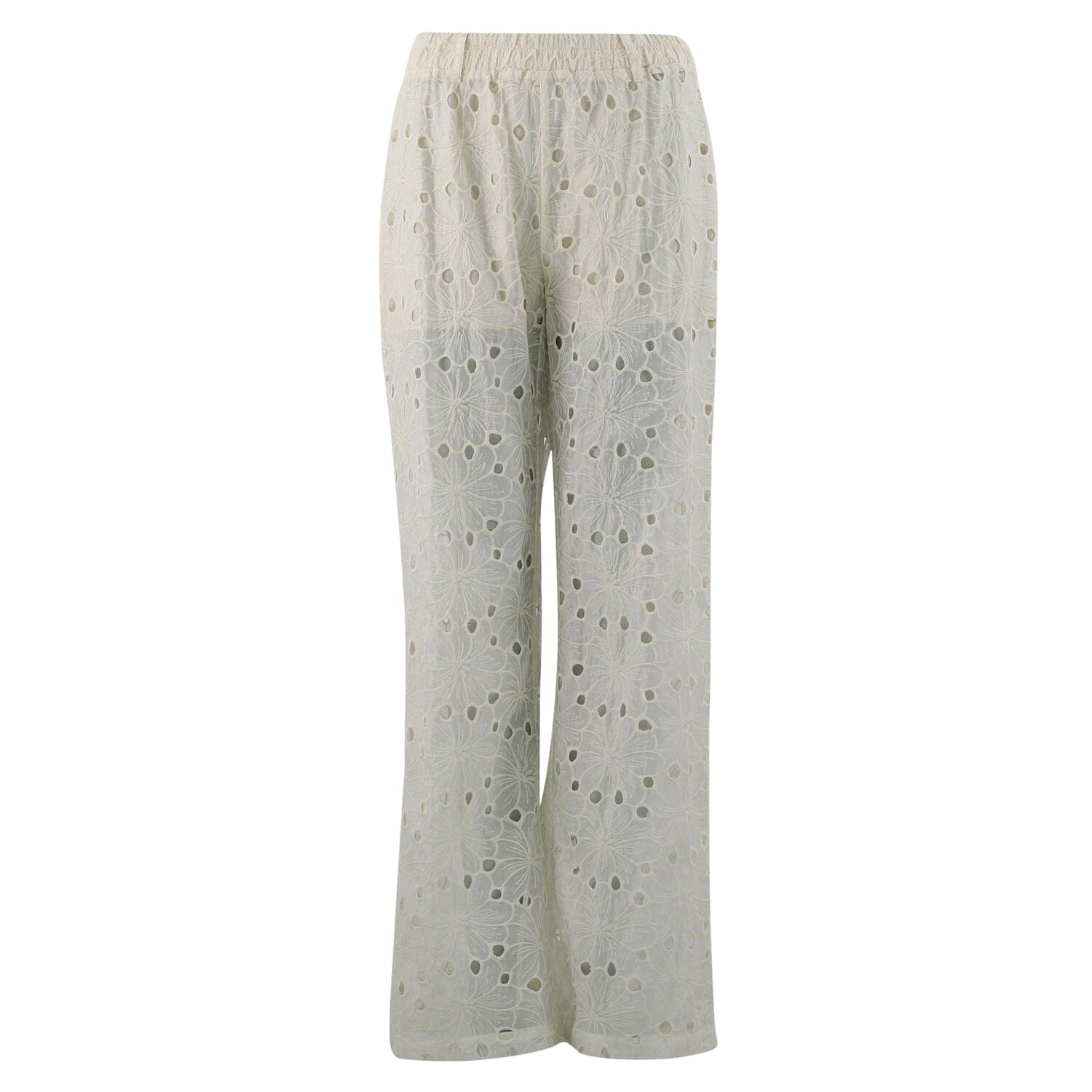 Lang jumpsuit fra Continue i off-white blonde med blomstermønster. Den har korte ermer, knappelukking foran og et bånd i midjen som kan justeres etter ønske.