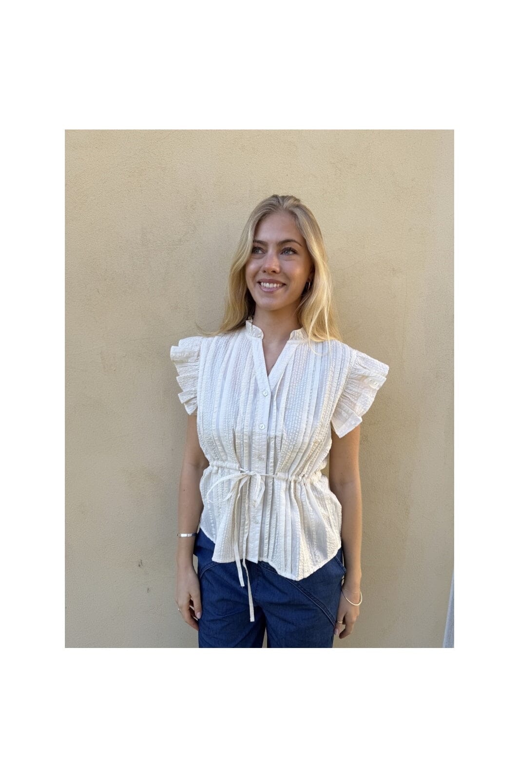 Kremfarget bluse fra Continue, laget av viskose og polyester. Blusen har korte volangermer, knappelukking foran og knytebånd i midjen.