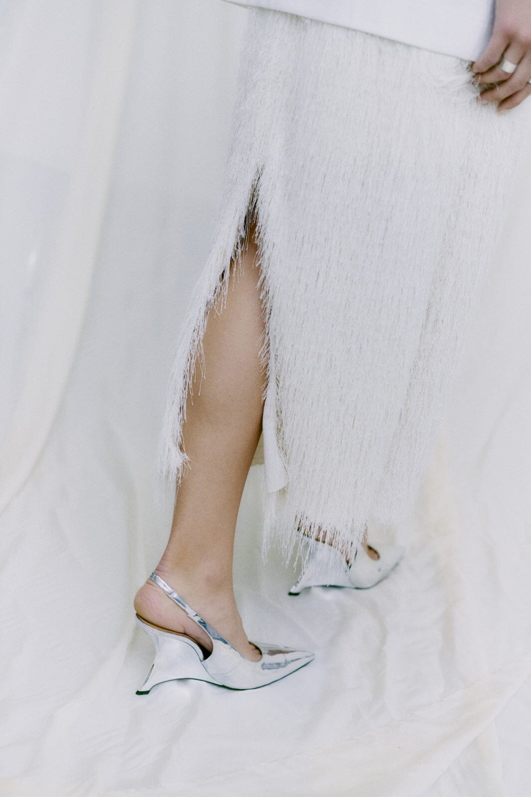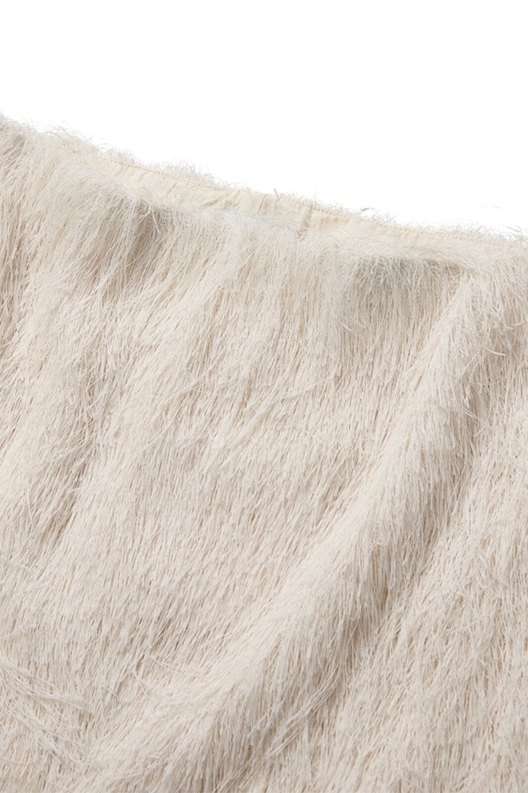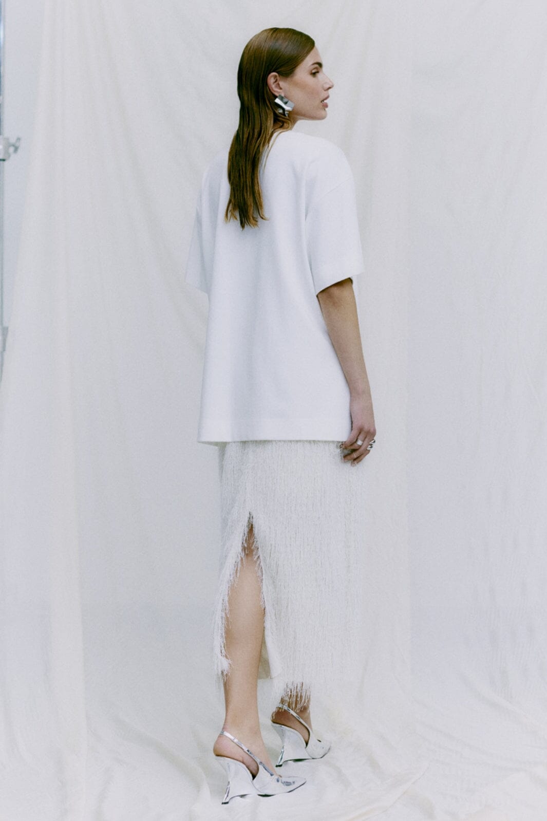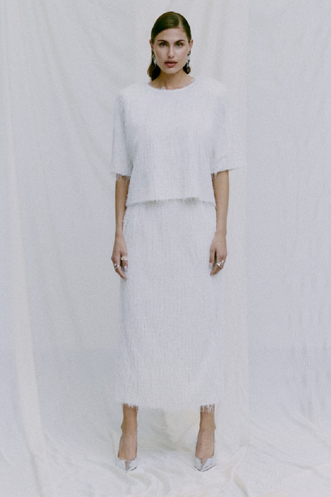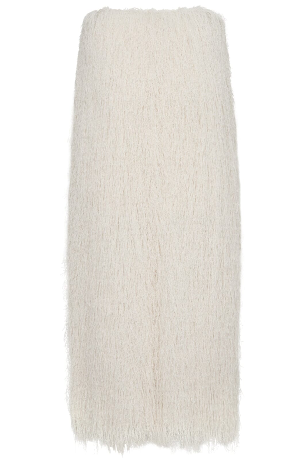 Kremhvit skjørt fra Copenhagen Muse med frynser fra topp til bunn. Skjørtet når til midten av leggen og har et mykt, strukturert stoff.