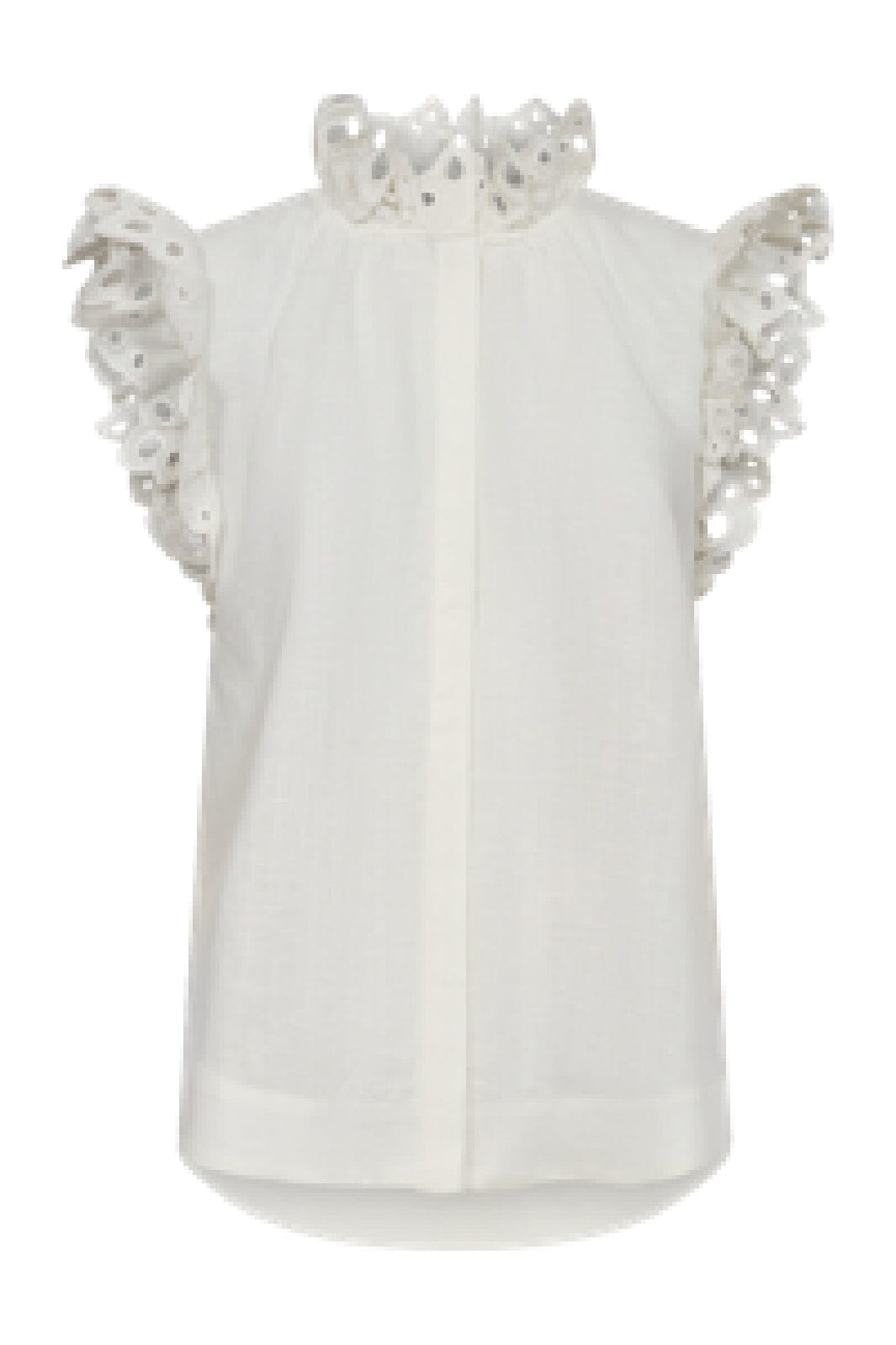 Hvit skjorte fra Copenhagen Muse med høy, rynket krage og blondekant på ermene. Skjorten har knappelukking foran og er laget av lett materiale med fine detaljer.
