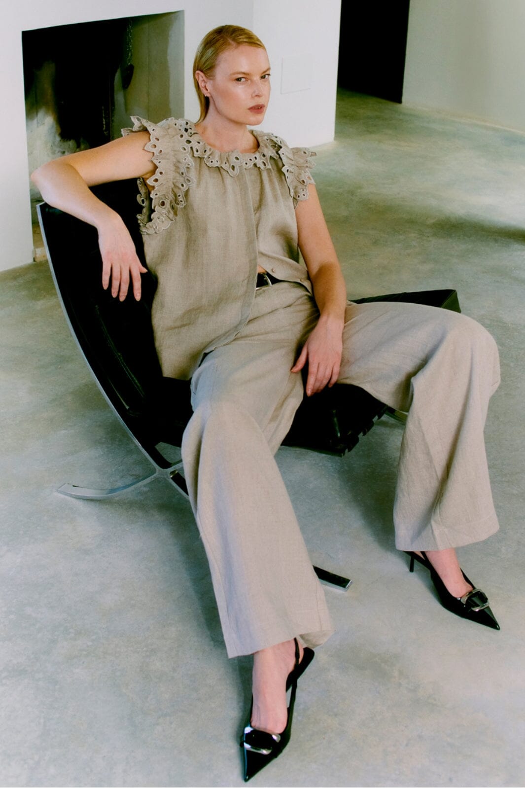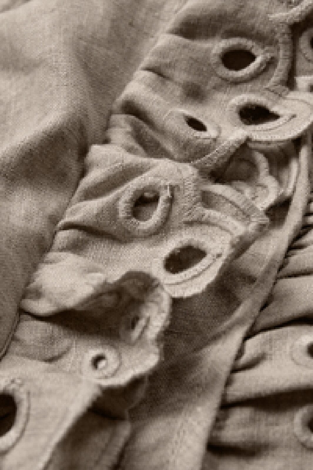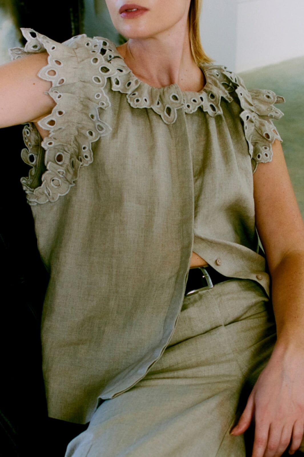 Skjorte fra Copenhagen Muse i lys grå med høy hals og volanger. Den har broderi og volangdetaljer som gir skjorten et håndlaget preg.