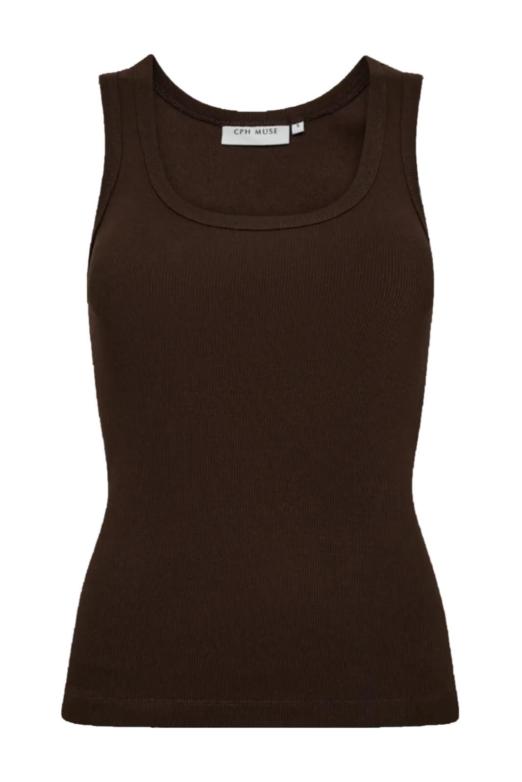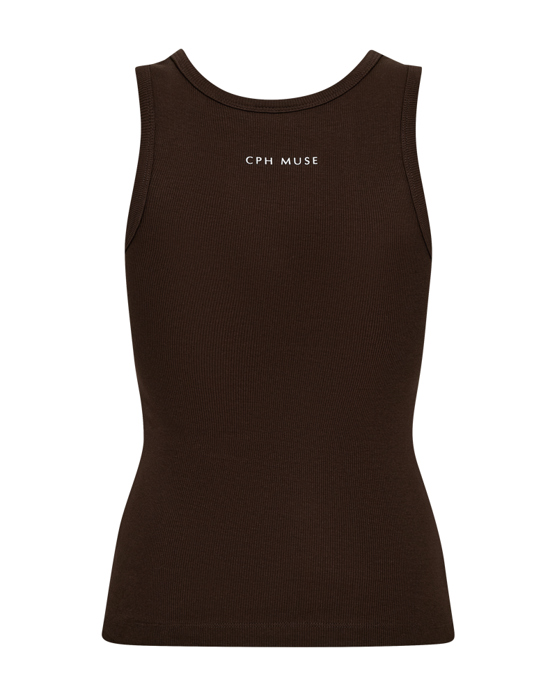 En brun tanktopp fra Copenhagen Muse, laget av økologisk bomull med en tettsittende passform. Toppen har brede stropper og en rund halsutringning.